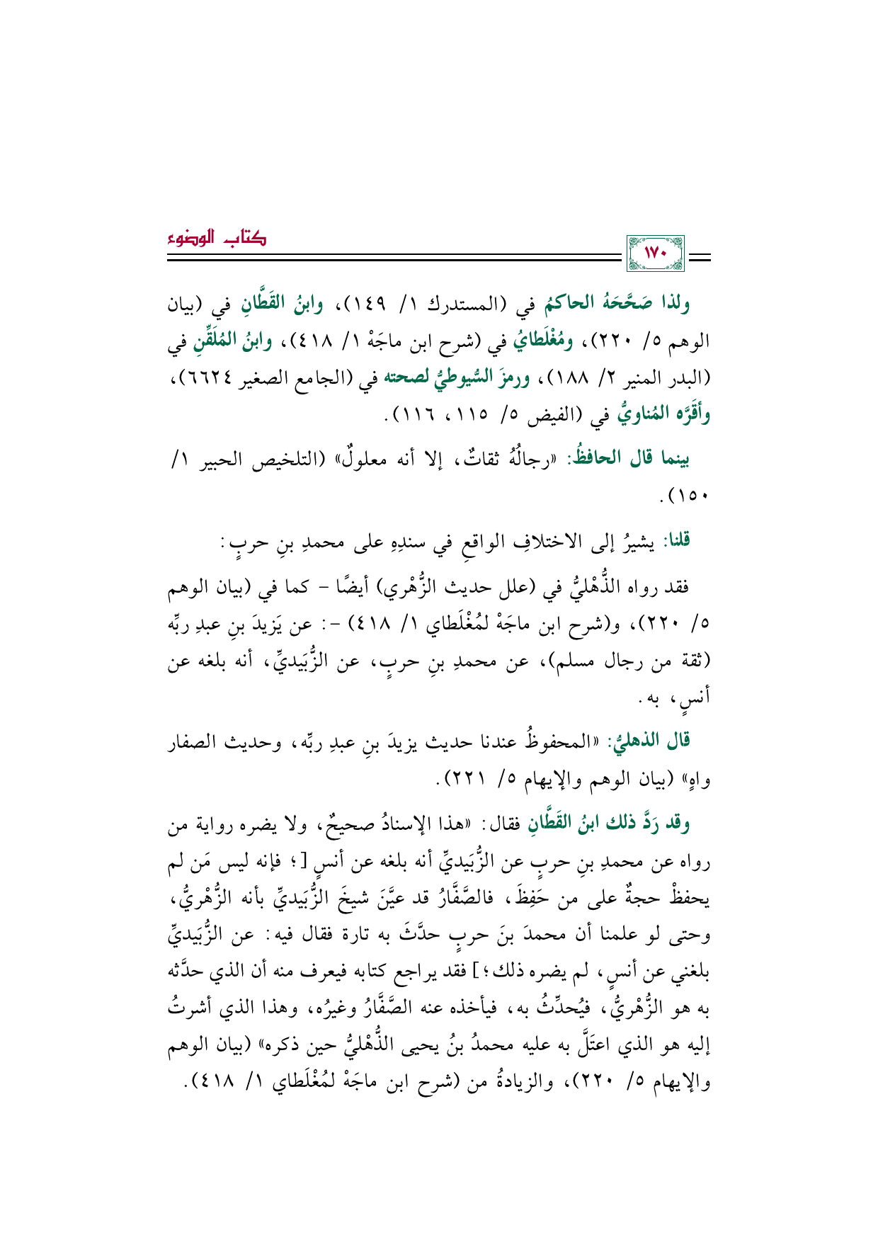 وقد رَدَّ ذلك ابنُ القَطَّانِ فقال: "هذا الإسنادُ صحيحٌ، ولا يضره رواية من رواه عن محمدِ بنِ حربٍ عن الزُّبَيديِّ أنه بلغه عن أنسٍ [؛ فإنه ليس مَن لم يحفظْ حجةٌ على من حَفِظَ، فالصَّفَّارُ قد عيَّنَ شيخَ الزُّبَيديِّ بأنه الزُّهْريُّ، وحتى لو علمنا أن محمدَ بنَ حربٍ حدَّثَ به تارة فقال فيه: عن الزُّبَيديِّ بلغني عن أنسٍ، لم يضره ذلك؛ ] فقد يراجع كتابه فيعرف منه أن الذي حدَّثه به هو الزُّهْريُّ، فيُحدِّثُ به، فيأخذه عنه الصَّفَّارُ وغيرُه، وهذا الذي أشرتُ إليه هو الذي اعتَلَّ به عليه محمدُ بنُ يحيى الذُّهْليُّ حين ذكره" (بيان الوهم والإيهام ٥/ ٢٢٠)، والزيادةُ من (شرح ابن ماجَهْ لمُغْلَطاي ١/ ٤١٨).