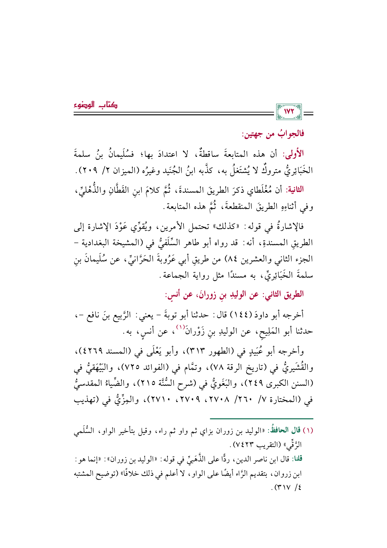 (¬١) قال الحافظُ: "الوليد بن زوران بزاي ثم واو ثم راء، وقيل بتأخير الواو، السُّلَمي الرَّقِّي" (التقريب ٧٤٢٣). قلنا: قال ابن ناصر الدين، ردًّا على الذَّهَبيِّ في قوله: "الوليد بن زوران": "إنما هو: ابن زروان، بتقديم الرَّاء أيضًا على الواو، لا أعلم في ذلك خلافًا" توضيح المشتبه (٤/ ٣١٧).