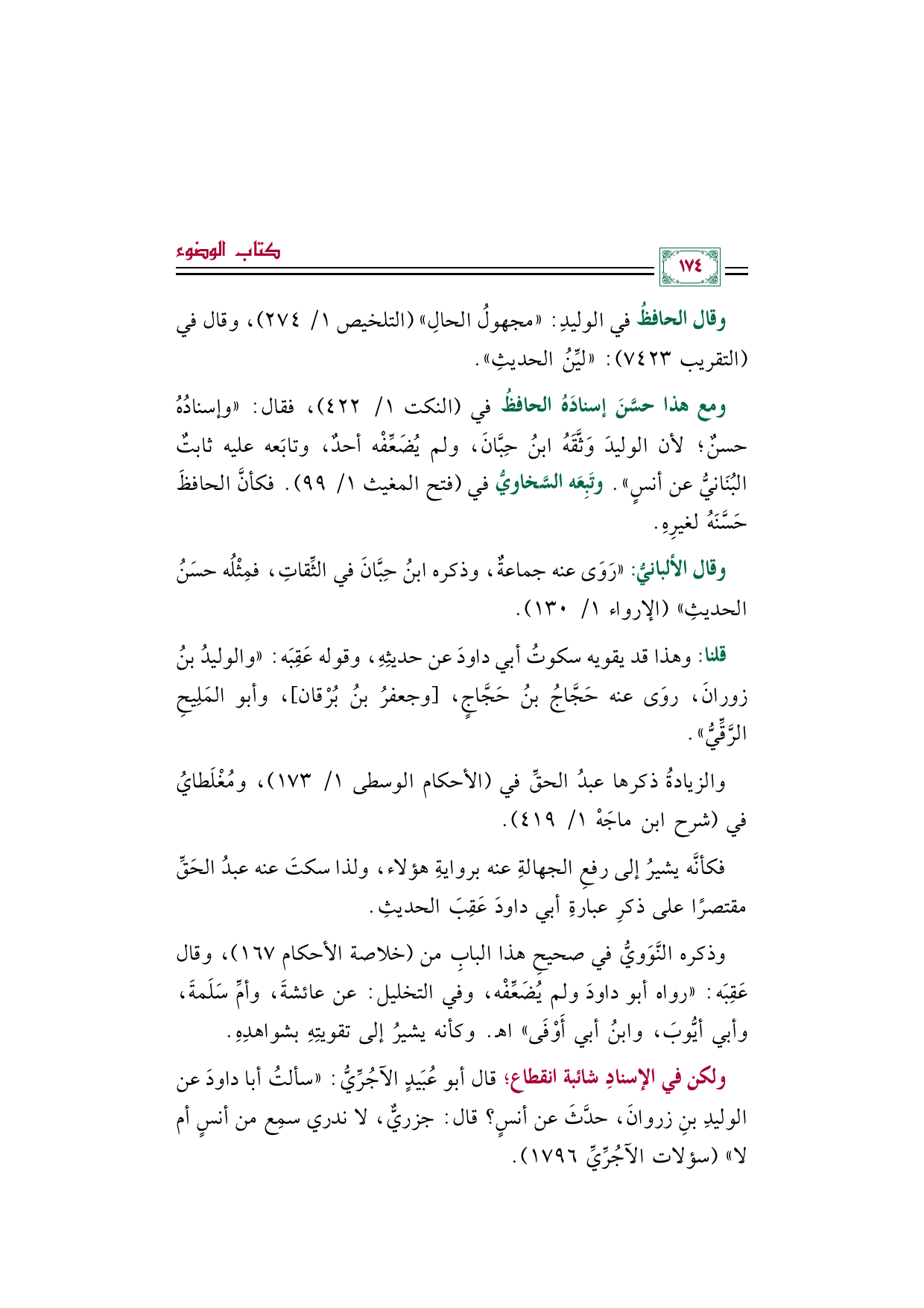 وقال الحافظُ في الوليدِ: "مجهولُ الحالِ" (التلخيص ١/ ٢٧٤)، وقال في (التقريب ٧٤٢٣): "ليِّنُ الحديثِ".