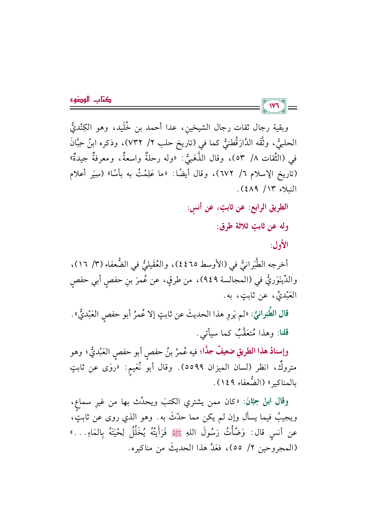 وإسنادُ هذا الطريقِ ضعيفٌ جدًّا؛ فيه عُمرُ بنُ حفصٍ أبو حفصٍ العَبْديُّ؛ وهو متروكٌ، انظر (لسان الميزان ٥٥٩٩). وقال أبو نُعَيمٍ: "روَى عن ثابتٍ بالمناكير" (الضُّعفاء ١٤٩).