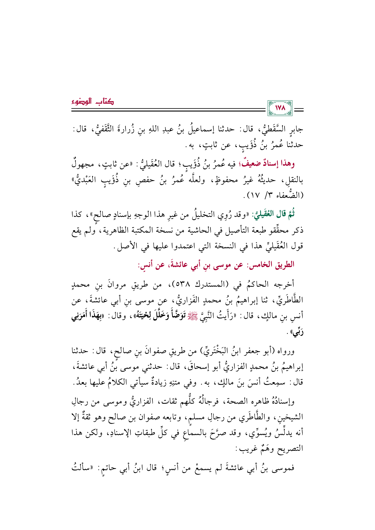 ثُمَّ قال العُقَيليُّ: "وقد رُوِي التخليلُ من غيرِ هذا الوجهِ بإسنادٍ صالحٍ"، كذا ذكر محقِّقو طبعة التأصيل في الحاشية من نسخة المكتبة الظاهرية، ولم يقع قول العُقَيليِّ هذا في النسخة التي اعتمدوا عليها في الأصل.