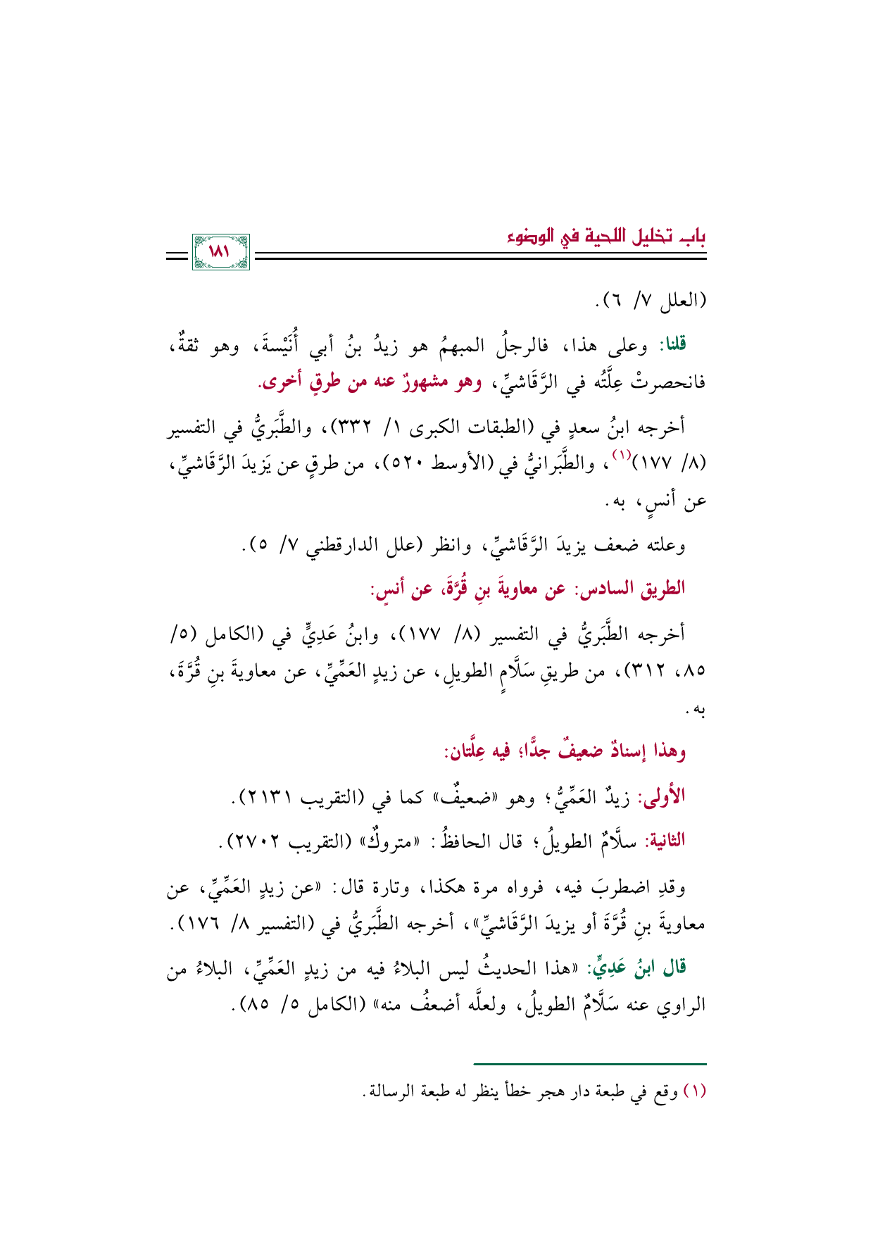 أخرجه الطَّبَريُّ في التفسير (٨/ ١٧٧)، وابنُ عَدِيٍّ في (الكامل (٥/ ٨٥، ٣١٢)، من طريقِ سَلَّامٍ الطويلِ، عن زيدٍ العَمِّيِّ، عن معاويةَ بنِ قُرَّةَ، به.
