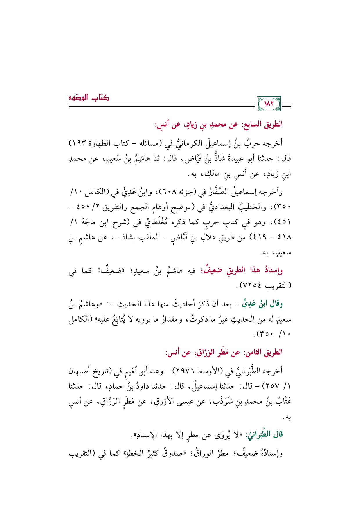 أخرجه حربُ بنُ إسماعيلَ الكرمانيُّ في (مسائله - كتاب الطهارة ١٩٣) قال: حدثنا أبو عبيدةَ شَاذُّ بنُ فَيَّاض، قال: ثنا هاشِمُ بنُ سَعيدٍ، عن محمدِ بنِ زيادٍ، عن أنسِ بنِ مالكٍ، به.