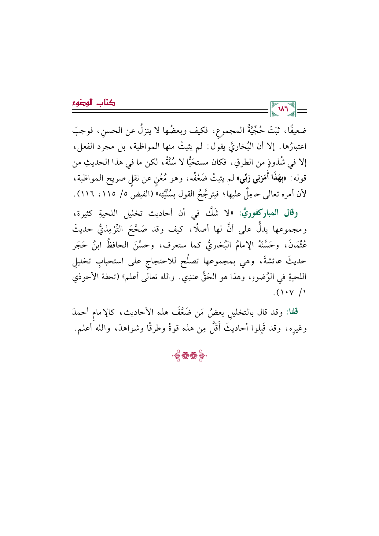 وقال المباركفوريُّ: "لا شَكَّ في أن أحاديث تخليل اللحيةِ كثيرة، ومجموعها يدلُّ على أنَّ لها أصلًا، كيف وقد صَحَّحَ التِّرْمِذيُّ حديثَ عُثْمَانَ، وحَسَّنَهُ الإمامُ البُخاريُّ كما ستعرف، وحسَّنَ الحافظُ ابنُ حَجَر حديثَ عائشةَ، وهي بمجموعها تصلُح للاحتجاجِ على استحبابِ تخليلِ اللحيةِ في الوُضوءِ، وهذا هو الحَقُّ عندِي. والله تعالى أعلم" (تحفة الأحوذي ١/ ١٠٧).