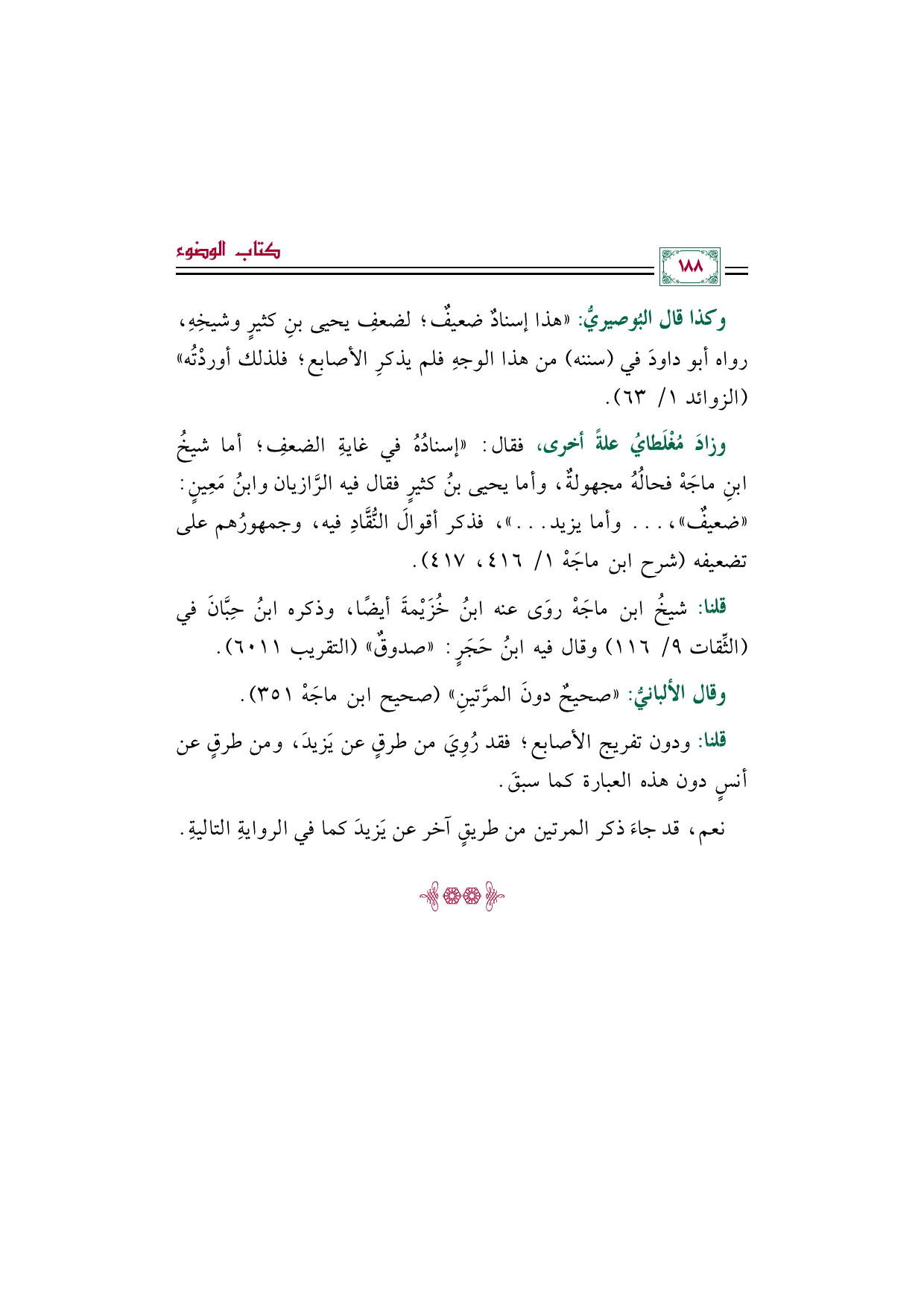 وكذا قال البُوصيريُّ: "هذا إسنادٌ ضعيفٌ؛ لضعفِ يحيى بنِ كثيرٍ وشيخِهِ، رواه أبو داودَ في (سننه) من هذا الوجهِ فلم يذكرِ الأصابع؛ فلذلك أوردْتُه" (الزوائد ١/ ٦٣).