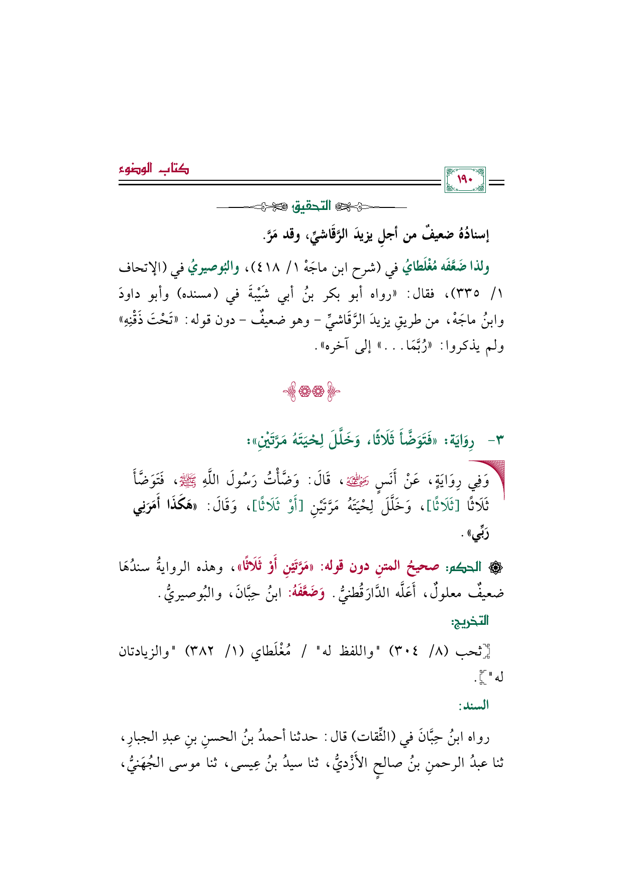 ولذا ضَعَّفَه مُغْلَطايُ في (شرح ابن ماجَهْ ١/ ٤١٨)، والبُوصيريُ في (الإتحاف ١/ ٣٣٥)، فقال: "رواه أبو بكر بنُ أبي شَيْبةَ في (مسنده) وأبو داودَ وابنُ ماجَهْ، من طريقِ يزيدَ الرَّقَاشيِّ -وهو ضعيفٌ- دون قوله: ((تَحْتَ ذَقْنِهِ)) ولم يذكروا: ((رُبَّمَا ... )) إلى آخره".