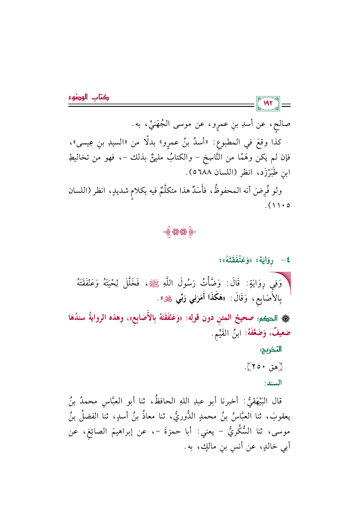 • وَفِي رِوَايَةٍ: قَالَ: وَضَّأْتُ رَسُولَ اللَّهِ صلى الله عليه وسلم، فَخَلَّلَ لِحْيَتَهُ وَعَنْفَقَتَهُ بِالأَصَابِعِ، وَقَالَ: «هَكَذَا أَمَرَنِي رَبِّي عَزَّ وَجَلَّ».