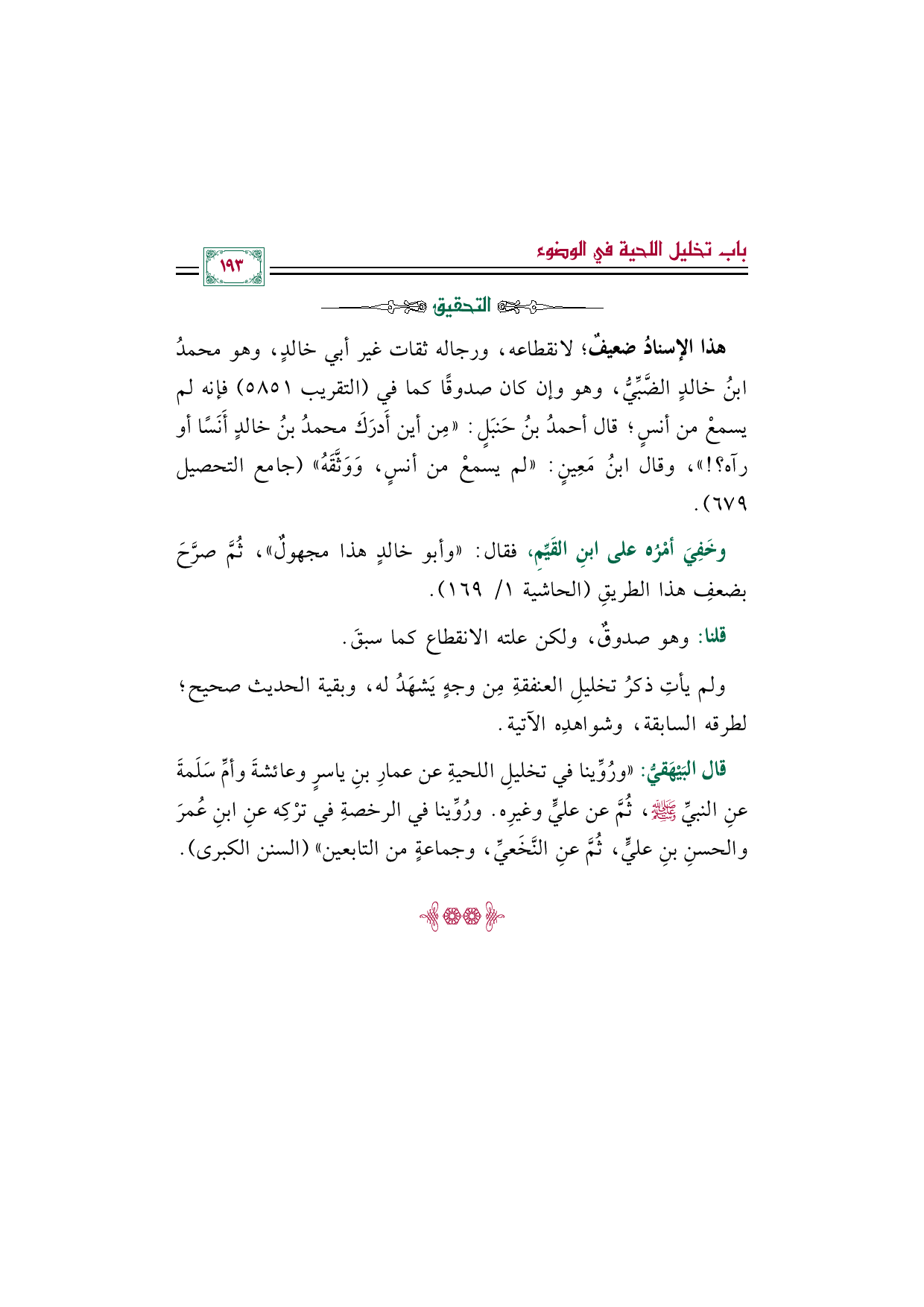 قال البَيْهَقيُّ: "ورُوِّينا في تخليلِ اللحيةِ عن عمارِ بنِ ياسرٍ وعائشةَ وأمِّ سَلَمةَ عنِ النبيِّ صلى الله عليه وسلم، ثُمَّ عن عليٍّ وغيرِه. ورُوِّينا في الرخصةِ في ترْكِه عنِ ابنِ عُمرَ والحسنِ بنِ عليٍّ، ثُمَّ عنِ النَّخَعيِّ، وجماعةٍ من التابعين" (السنن الكبرى).
