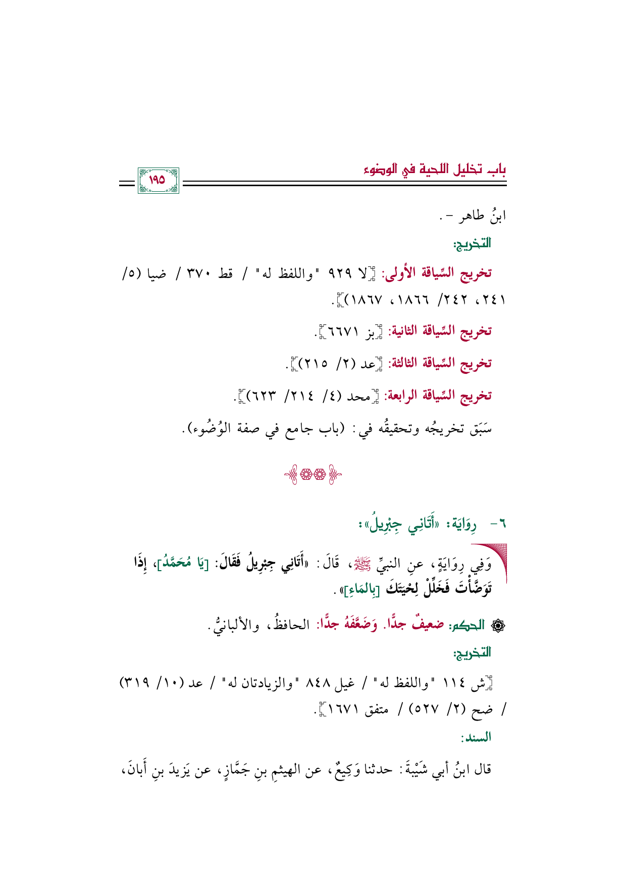 • وَفِي رِوَايَةٍ، عنِ النبيِّ صلى الله عليه وسلم، قَالَ: ((أَتَانِي جِبْرِيلُ فَقَالَ: [يَا مُحَمَّدُ]، إِذَا تَوَضَّأْتَ فَخَلِّلْ لِحْيَتَكَ [بِالمَاءِ])).