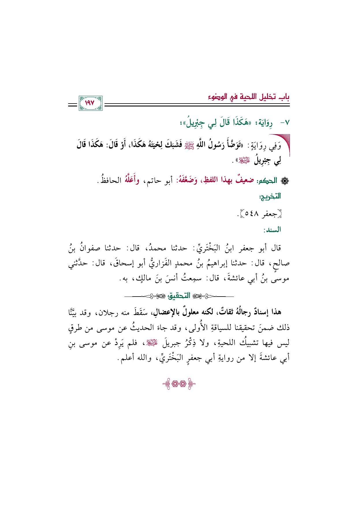هذا إسنادٌ رجالُهُ ثقاتٌ، لكنه معلولٌ بالإعضالِ، سَقَطَ منه رجلان، وقد بيَّنَّا ذلك ضمنَ تحقيقنا للسياقةِ الأُولى، وقد جاءَ الحديثُ عن موسى من طرقٍ ليس فيها تشبيكُ اللحيةِ، ولا ذِكْرُ جبريلَ عليه السلام، فلم يَرِدْ عن موسى بنِ أبي عائشةَ إلا من روايةِ أبي جعفرٍ البَخْتَريِّ، والله أعلم.