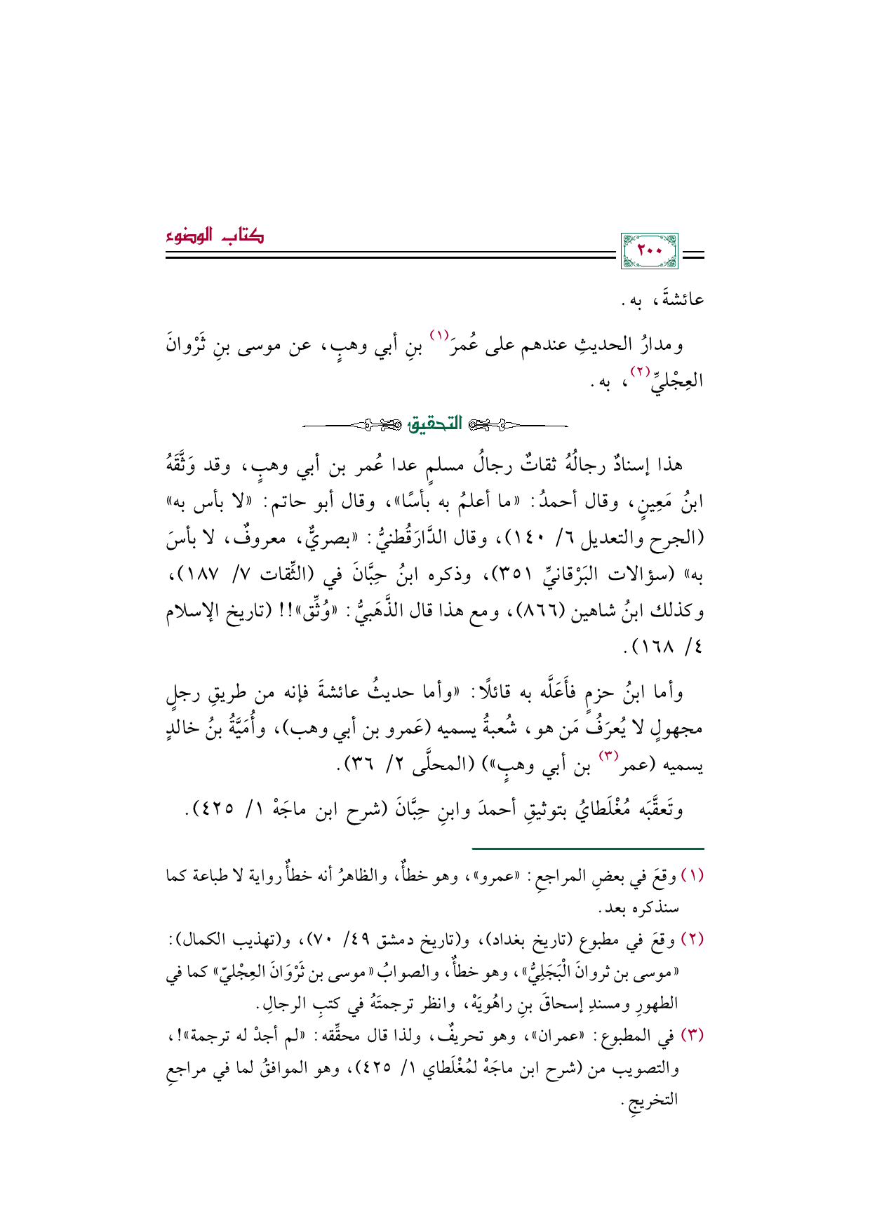 (¬٢) وقعَ في مطبوع (تاريخ بغداد)، و (تاريخ دمشق ٤٩/ ٧٠)، و (تهذيب الكمال): "موسى بن ثروانَ الْبَجَلِيُّ"، وهو خطأٌ، والصوابُ "موسى بن ثَرْوَانَ العِجْليّ" كما في الطهورِ ومسندِ إسحاقَ بنِ راهُويَهْ، وانظر ترجمتَهُ في كتبِ الرجالِ.