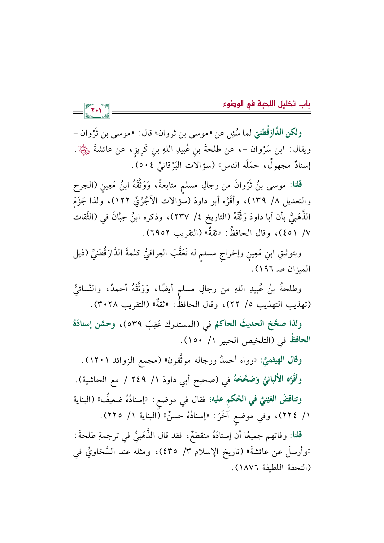 ولكن الدَّارَقُطنيّ لما سُئِل عن "موسى بن ثروان" قال: "موسى بن ثَرْوان -ويقال: ابن سَرْوان-، عن طلحةَ بنِ عُبيدِ اللهِ بنِ كَرِيزٍ، عن عائشةَ رضي الله عنها. إسنادٌ مجهولٌ، حمَلَه الناس" (سؤالات البَرْقانيِّ ٥٠٤).