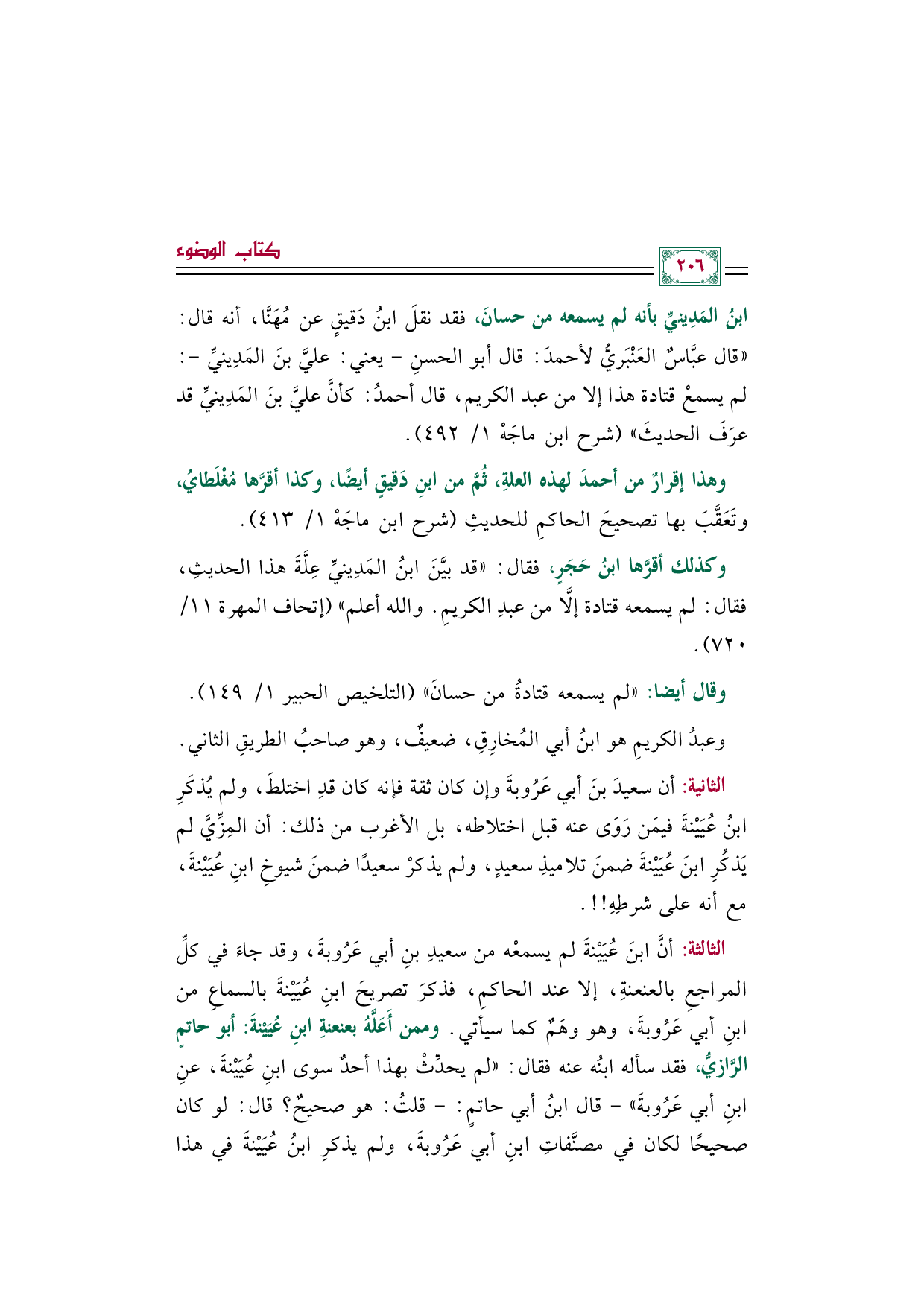 ابنُ المَدِينيِّ بأنه لم يسمعه من حسانَ، فقد نقلَ ابنُ دَقيقٍ عن مُهَنَّا، أنه قال: "قال عبَّاسٌ العَنْبَريُّ لأحمدَ: قال أبو الحسنِ -يعني: عليَّ بنَ المَدِينيِّ-: لم يسمعْ قتادة هذا إلا من عبد الكريم، قال أحمدُ: كأنَّ عليَّ بنَ المَدِينيِّ قد عرَفَ الحديثَ" (شرح ابن ماجَهْ ١/ ٤٩٢).