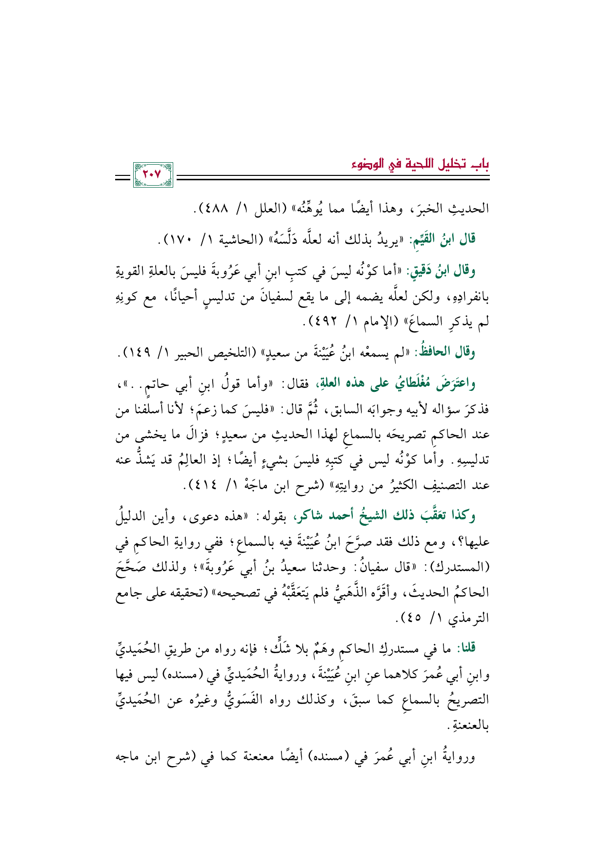 وكذا تعَقَّبَ ذلك الشيخُ أحمد شاكر، بقوله: "هذه دعوى، وأين الدليل عليها؟ ، ومع ذلك فقد صرَّحَ ابنُ عُيَيْنةَ فيه بالسماعِ؛ ففي روايةِ الحاكمِ في (المستدرك): "قال سفيانُ: وحدثنا سعيدُ بنُ أبي عَرُوبةَ"؛ ولذلك صَحَّحَ الحاكمُ الحديثَ، وأقَرَّه الذَّهَبيُّ فلم يَتعَقَّبْهُ في تصحيحه" (تحقيقه على جامع الترمذي ١/ ٤٥).