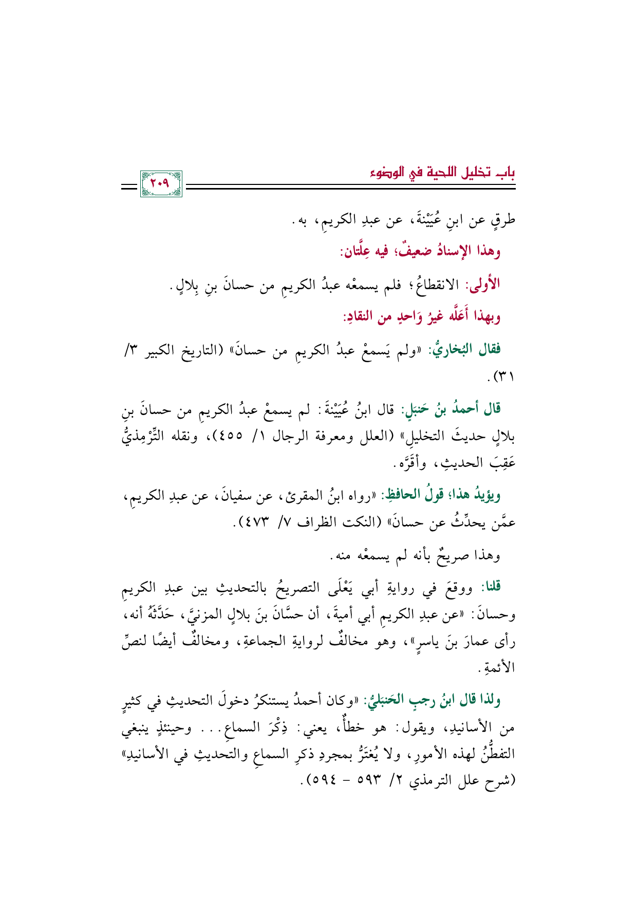 * قال أحمد بن حَنبَل: قال ابنُ عُيَيْنةَ: لم يسمع عبد الكريم من حسان بن بلال حديثَ التخليل" (العلل ومعرفة الرجال (١/ ٤٥٥)، ونقله التِّرْمِذيُّ عَقِبَ الحديث، وأقَرَّه.