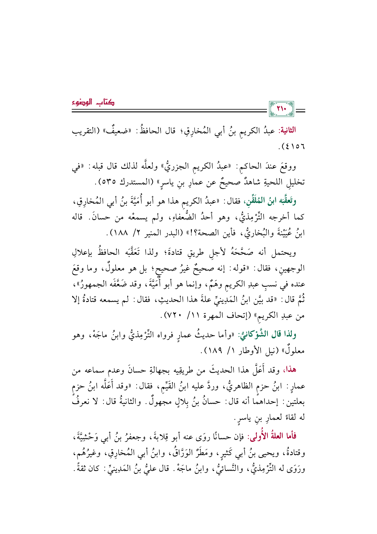 وتَعقَّبَه ابن المُلَقِّنِ، فقال: "عبد الكريم هذا هو أبو أُمَيَّةَ بن أبي المُخارِقِ، كما أخرجه التِّرْمِذيُّ، وهو أحد الضُّعفاء، ولم يسمعه من حسان. قاله ابن عُيَيْنةَ والبُخاريُّ، فأين الصحة؟ ! " (البدر المنير ٢/ ١٨٨).