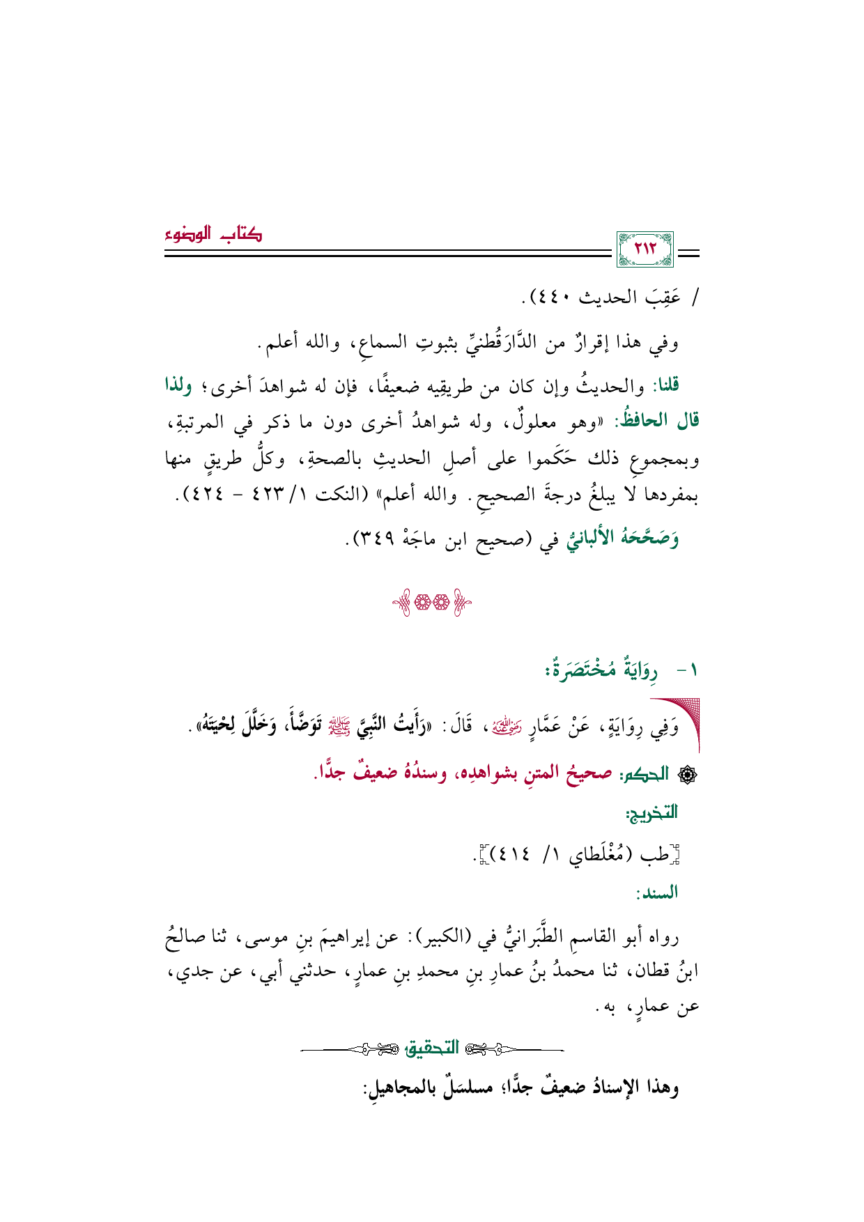 قلنا: والحديثُ وإن كان من طريقِيه ضعيفًا، فإن له شواهدَ أخرى؛ ولذا قال الحافظُ: "وهو معلول، وله شواهد أخرى دون ما ذكر في المرتبة، وبمجموع ذلك حَكَموا على أصل الحديث بالصحةِ، وكلُّ طريق منها بمفردها لا يبلغ درجة الصحيح. والله أعلم" (النكت ١/ ٤٢٣ - ٤٢٤).