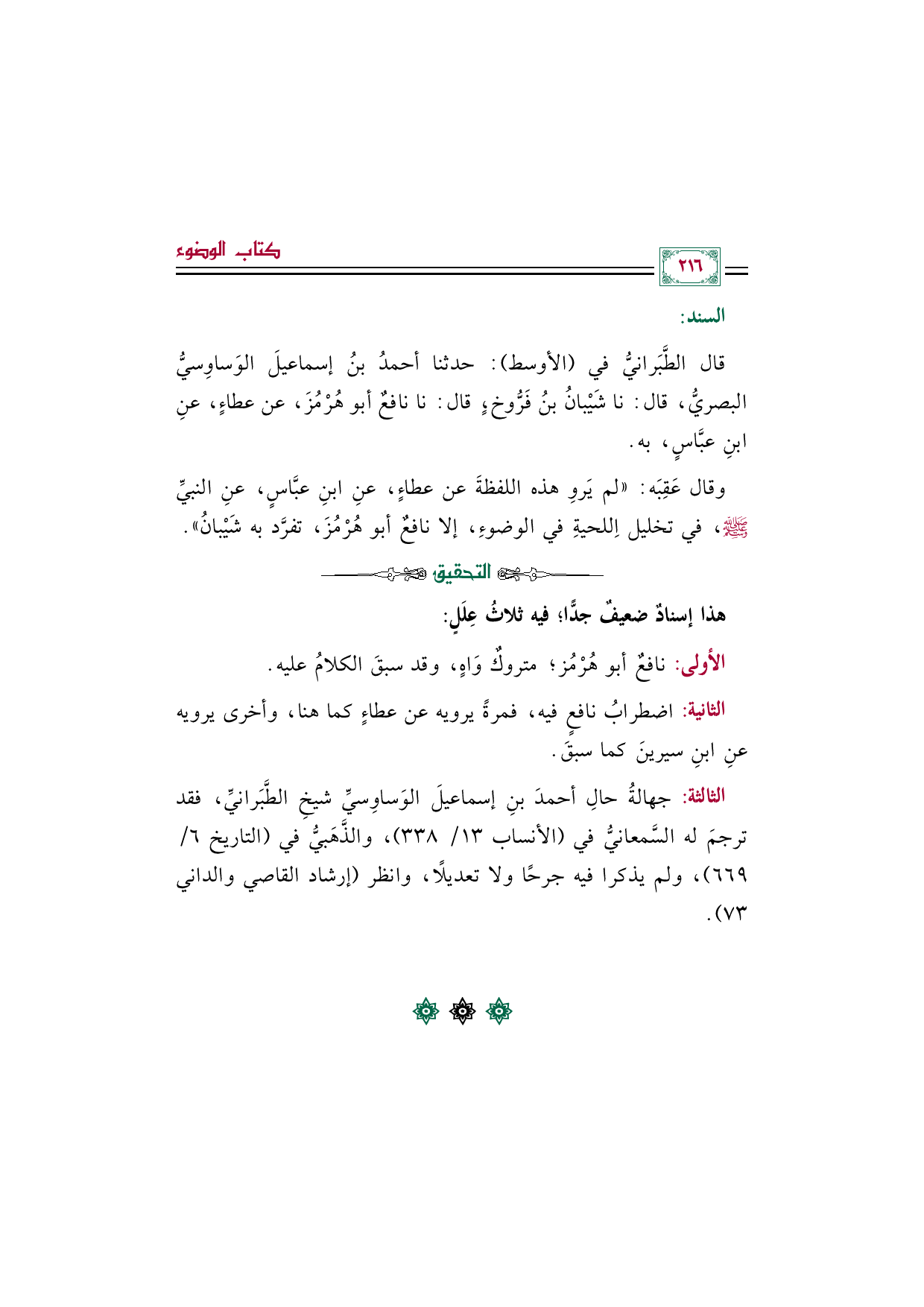 الثالثة: جهالة حالِ أحمدَ بنِ إسماعيلَ الوَساوِسيِّ شيخِ الطَّبَرانيِّ، فقد ترجم له السَّمعانيُّ في (الأنساب ١٣/ ٣٣٨)، والذَّهَبيُّ في (التاريخ ٦/ ٦٦٩)، ولم يذكرا فيه جرحًا ولا تعديلًا، وانظر (إرشاد القاصي والداني ٧٣).