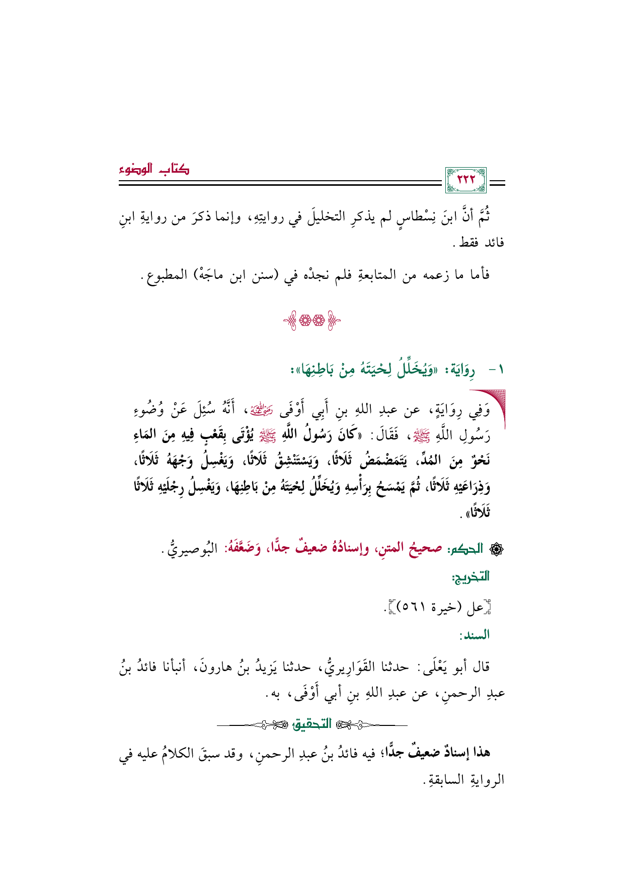 ثُمَّ أنَّ ابنَ نِسْطاس لم يذكر التخليلَ في روايتِهِ، وإنما ذكر من روايةِ ابن فائد فقط.