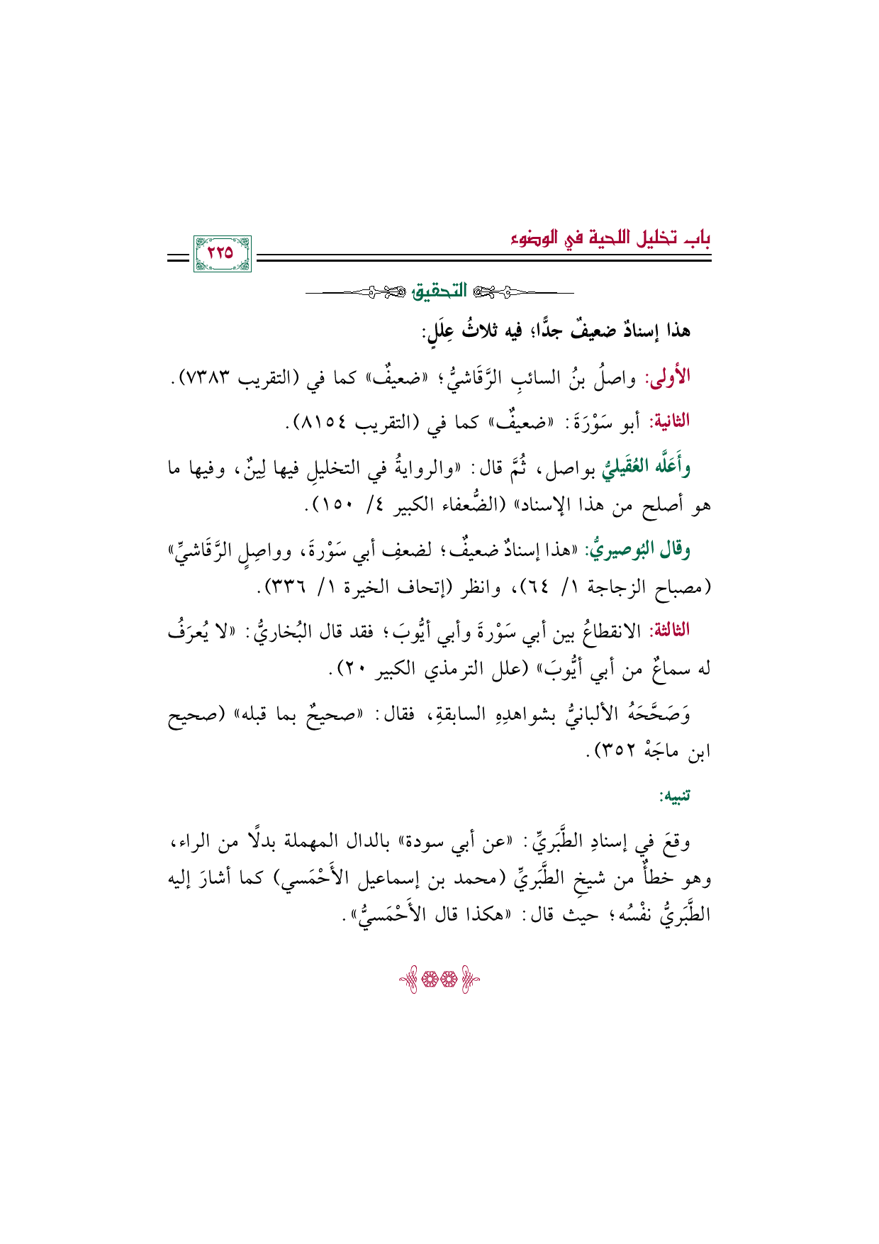وأَعَلَّه العُقَيليّ بواصل، ثُمَّ قال: "والرواية في التخليل فيها لِينٌ، وفيها ما هو أصلح من هذا الإسناد" (الضُّعفاء الكبير ٤/ ١٥٠).