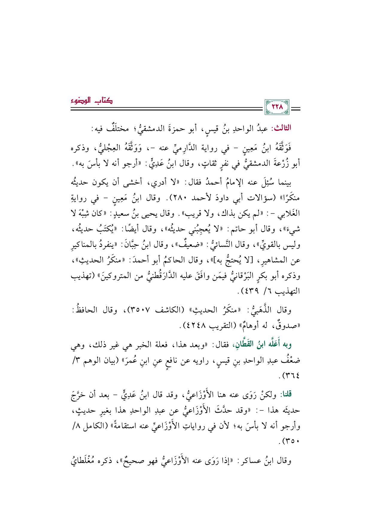 قلنا: ولكنْ رَوَى عنه هنا الأَوْزَاعيّ، وقد قال ابنُ عَدِيٍّ - بعد أن خرَّج حديثَه هذا -: "وقد حدَّث الأَوْزَاعيُّ عن عبد الواحد هذا بغير حديث، وأرجو أنه لا بأس به؛ لأن في روايات الأَوْزَاعيِّ عنه استقامةً" (الكامل ٨/ ٣٥٠).