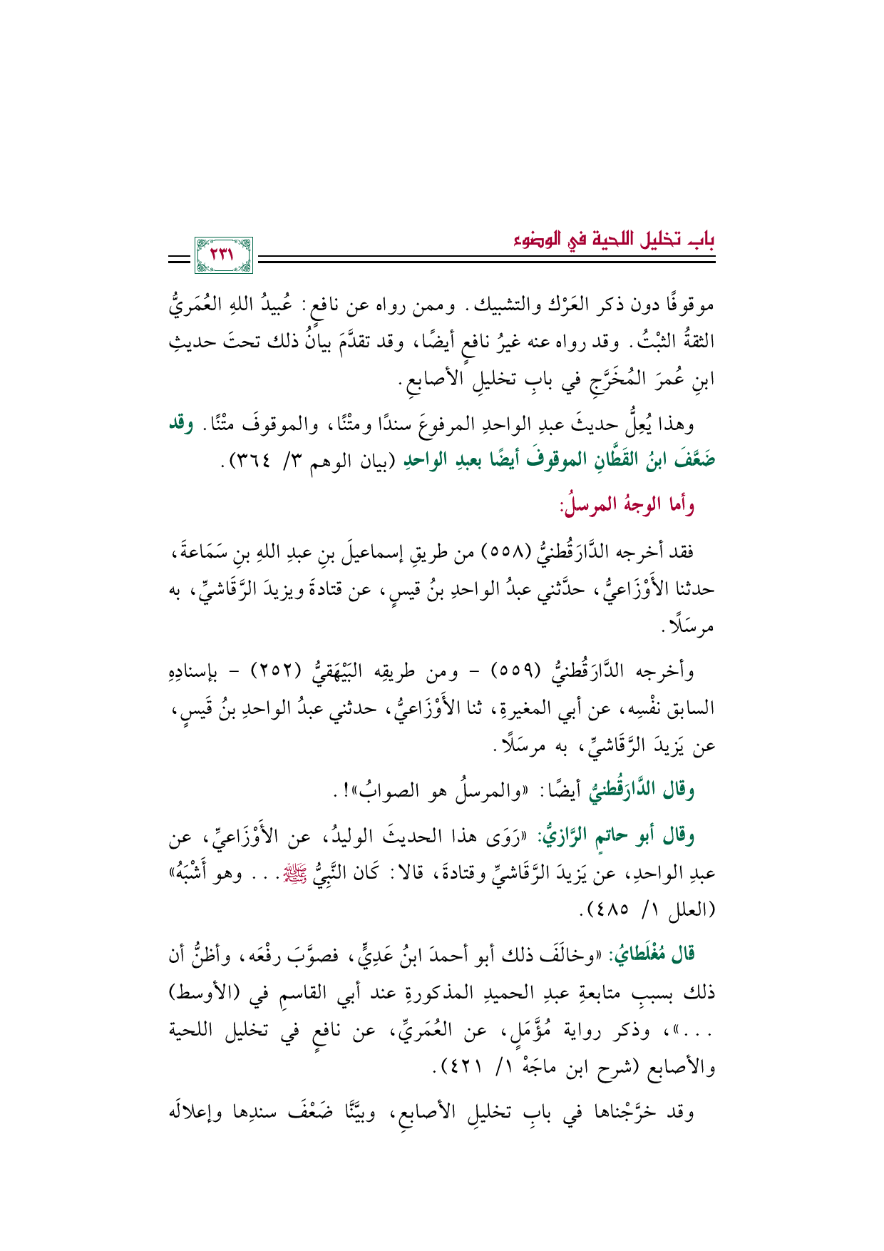 قال مُغْلَطاي: "وخالَف ذلك أبو أحمدَ ابنُ عَدِيٍّ، فصوَّب رفْعَه، وأظنُّ أن ذلك بسبب متابعة عبد الحميد المذكورةِ عند أبي القاسم في (الأوسط) ... "، وذكر رواية مُؤَّمَلٍ، عن العُمَري، عن نافعٍ في تخليل اللحية والأصابع (شرح ابن ماجَهْ ١/ ٤٢١).