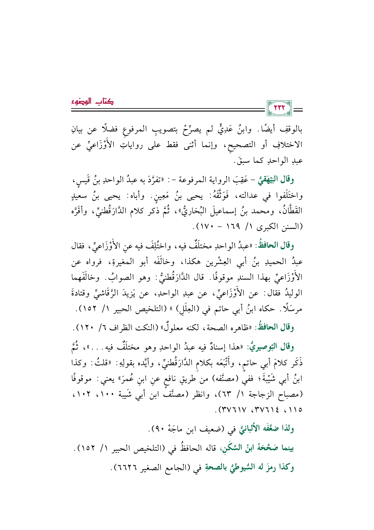 بالوقف أيضًا. وابنُ عَدِيٍّ لم يصرِّح بتصويب المرفوع فضلًا عن بيان الاختلاف أو التصحيح، وإنما أثنى فقط على روايات الأَوْزَاعيِّ عن عبد الواحد كما سبقَ.