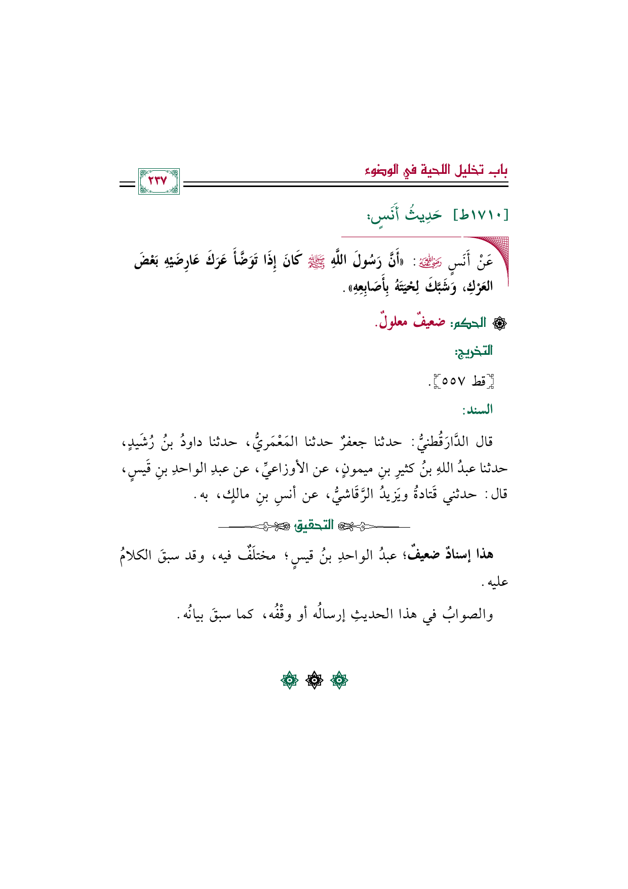 قال (الدَّارَقُطنيُّ): حدثنا جعفر حدثنا المَعْمَريُّ، حدثنا داود بن رُشَيد، حدثنا عبدُ اللهِ بنُ كثير بن ميمون، عن الأوزاعيِّ، عن عبد الواحد بن قيس، قال: حدثني قَتادةُ ويَزيدُ الرَّقَاشيُّ، عن أنس بن مالكٍ، به.