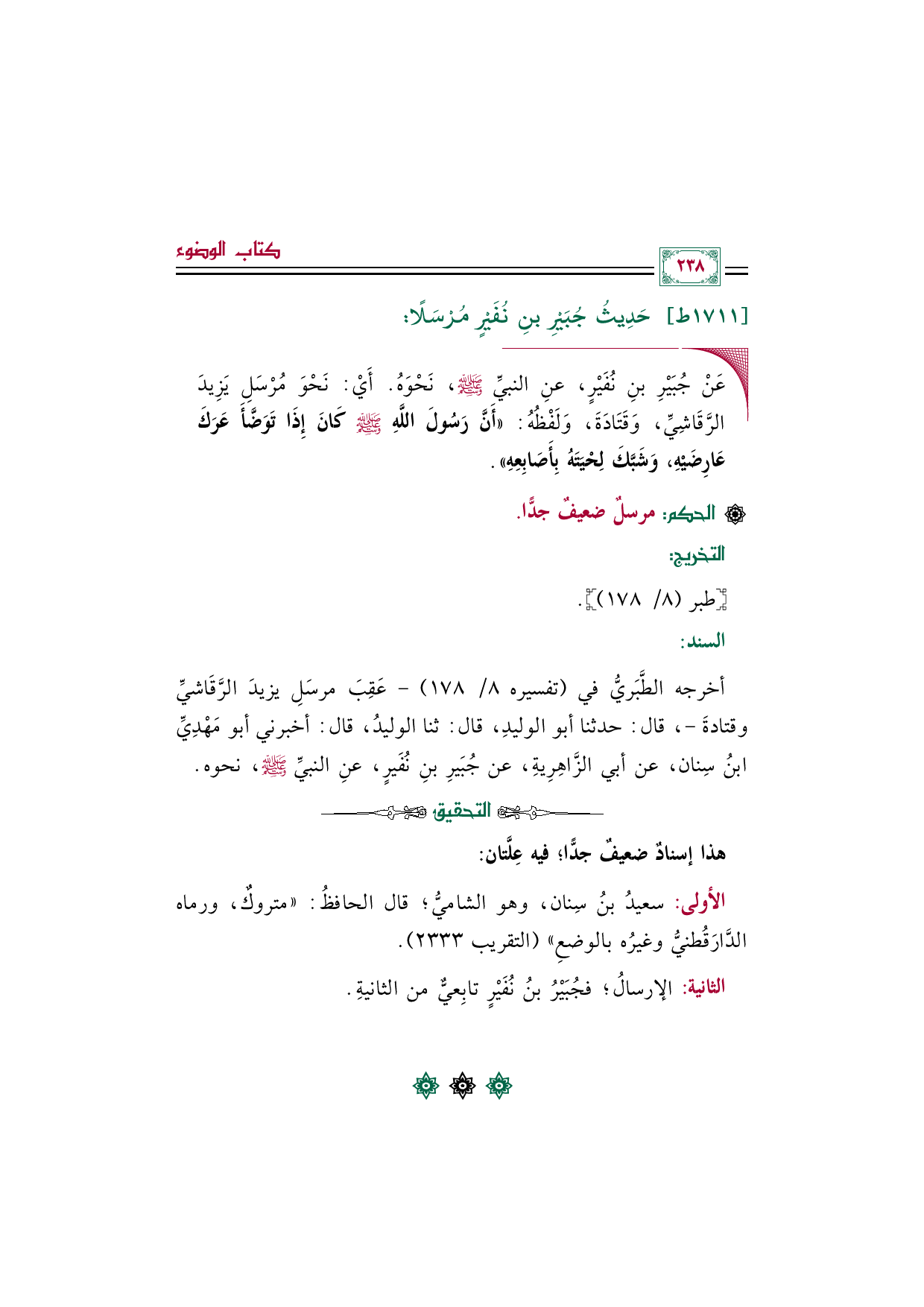 ◼ عَنْ جُبَيْرِ بْنِ نُفَيْرٍ، عنِ النبيِّ صلى الله عليه وسلم، نَحْوَهُ. أَيْ: نَحْوَ مُرْسَلِ يَزِيدَ الرَّقَاشِيِّ، وَقَتَادَةَ، وَلَفْظُهُ: ((أَنَّ رَسُولَ اللَّهِ صلى الله عليه وسلم كَانَ إِذَا تَوَضَّأَ عَرَكَ عَارِضَيْهِ، وَشَبَكَ لِحْيَتَهُ بِأَصَابِعِهِ)).