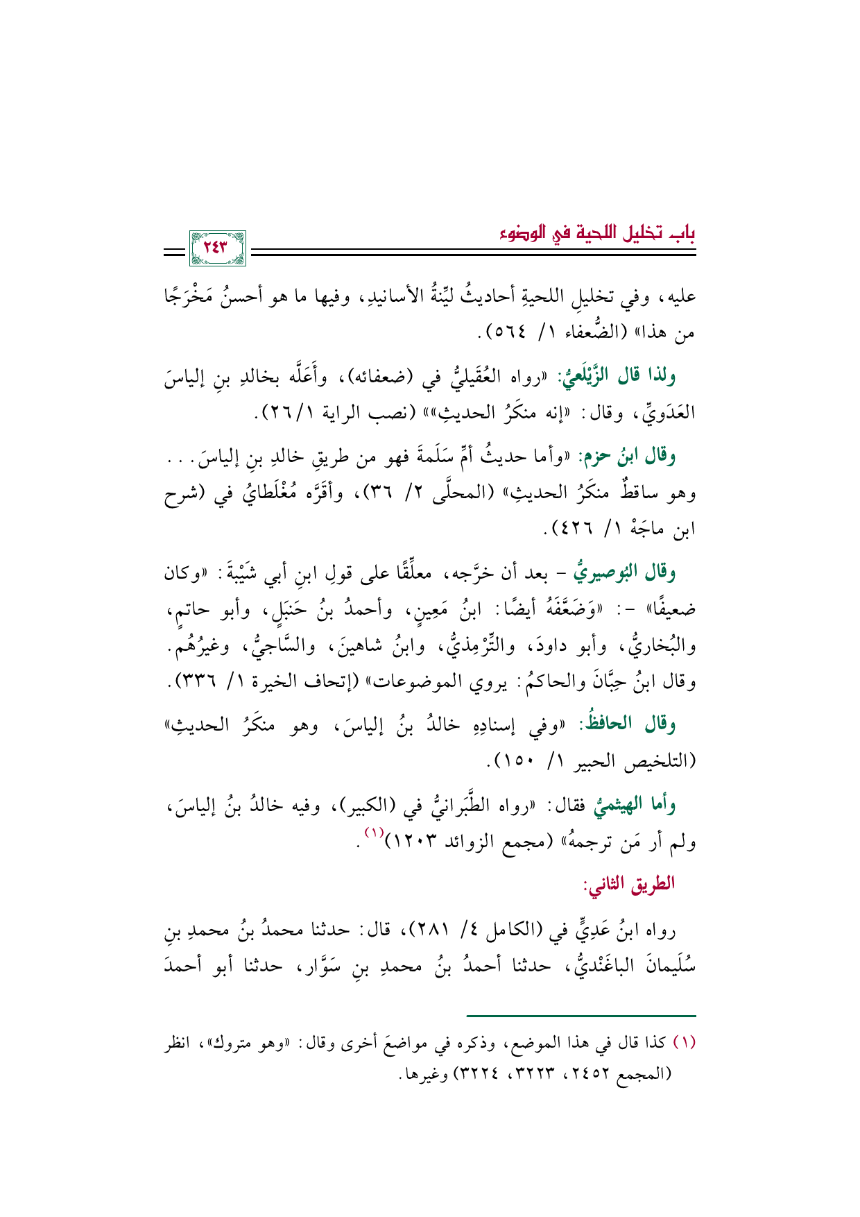 وأما الهيثميُّ فقال: "رواه الطَّبَرانيُّ في الكبير، وفيه خالد بن إلياس، ولم أر مَن ترجمهُ" (مجمع الزوائد ١٢٠٣) (¬١).