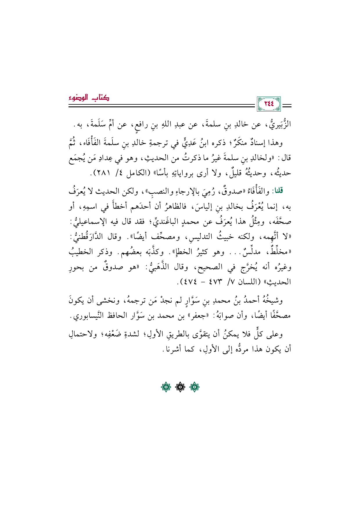 قلنا: والفَأْفَاءُ "صدوقٌ، رُمِي بالإرجاء والنصب"، ولكن الحديث لا يُعرَفُ به، إنما يُعْرَف بخالد بن إلياس، فالظاهر أن أحدهم أخطأ في اسمه، أو صحَّفه، ومِثْلُ هذا يُعرَف عن محمد الباغَندي؛ فقد قال فيه الإسماعيلي: "لا أتَّهِمه، ولكنه خبيث التدليس، ومصحِّف أيضًا". وقال الدَّارَقُطنيُّ: "مخلِّط، مدلِّس ... وهو كثير الخطإِ". وكذَّبَه بعضُهم. وذكر الخطيب وغيرُه أنه يُخرَّج في الصحيح، وقال الذَّهَبيُّ: "هو صدوقٌ من بحور الحديث" (اللسان ٧/ ٤٧٣ - ٤٧٤).