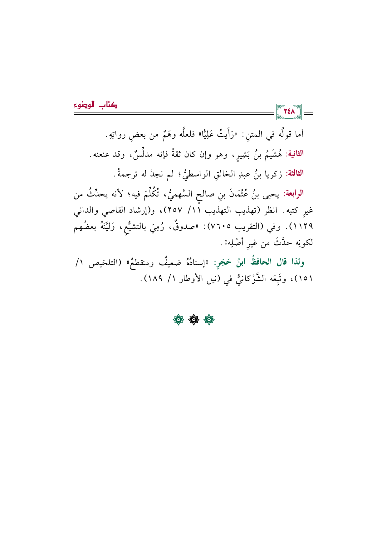 ولذا قال الحافظُ ابنُ حَجَر: "إسنادُهُ ضعيفٌ ومنقطع" (التلخيص ١/ ١٥١)، وتَبِعَه الشَّوْكانيُّ في (نيل الأوطار ١/ ١٨٩).
