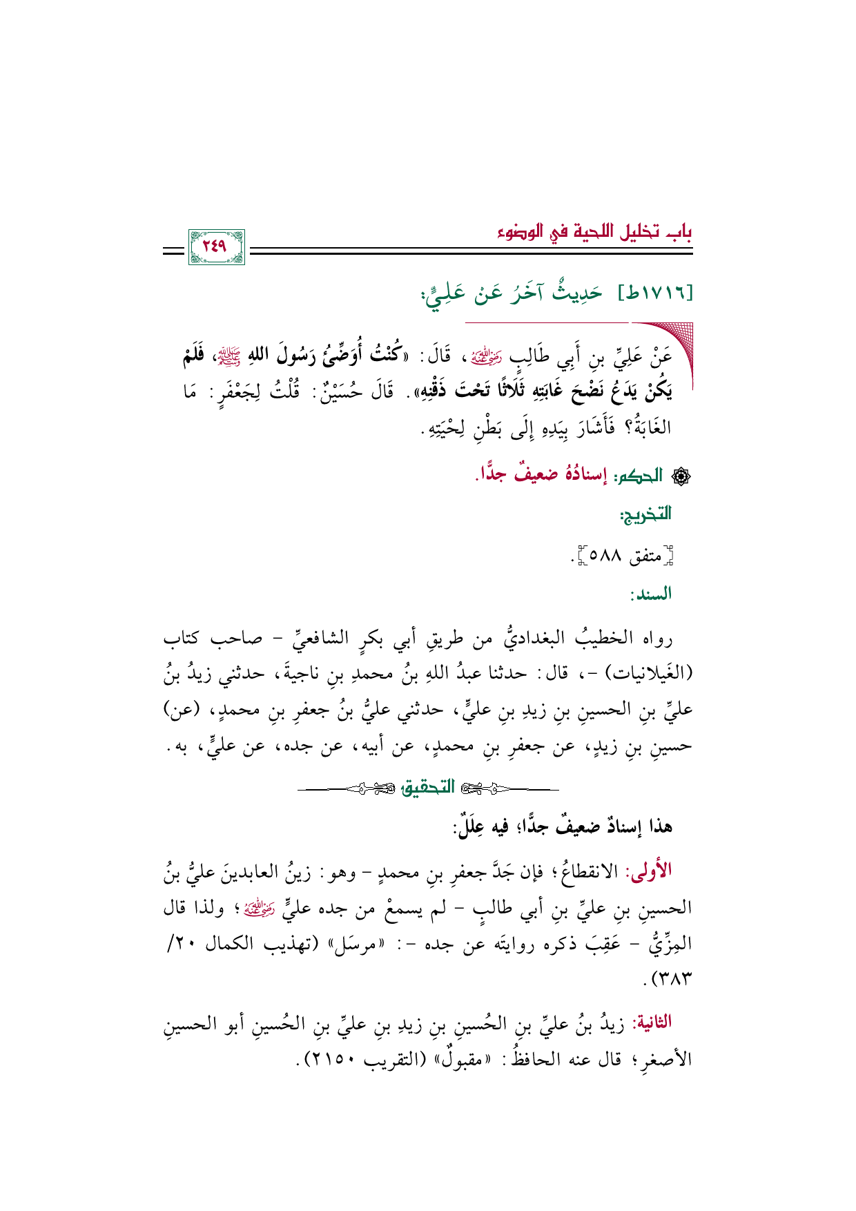 رواه الخطيب البغدادي: من طريقِ أبي بكر الشافعي - صاحب كتاب (الغَيلانيات) -، قال: حدثنا عبدُ اللهِ بنُ محمد بن ناجيةَ، حدثني زيد بن عليِّ بن الحسين بن زيد بن عليٍّ، حدثني عليُّ بن جعفر بن محمد، (عن) (¬١) حسين بن زيد، عن جعفر بن محمد، عن أبيه، عن جده، عن عليٍّ، به.