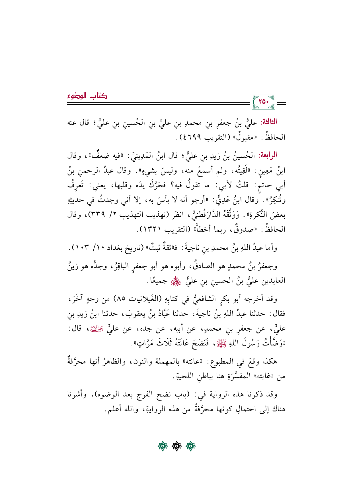 الرابعة: الحُسين بن زيد بن عليٍّ؛ قال ابنُ المَدِينيِّ: "فيه ضعفٌ"، وقال ابنُ مَعِينٍ: "لَقِيتُه، ولم أسمع منه، وليس بشيءٍ". وقال عبد الرحمن بن أبي حاتم: قلت لأبي: ما تقول فيه؟ فحَرَّك يده وقلبها، يعني: تَعرِف وتُنكِر". وقال ابنُ عَدِيٍّ: "أرجو أنه لا بأس به، إلا أني وجدتُ في حديثِه بعض النكرة". وَوَثَّقَهُ الدَّارَقُطنيُّ، انظر (تهذيب التهذيب ٢/ ٣٣٩)، وقال الحافظُ: "صدوقٌ، ربما أخطأ" (التقريب ١٣٢١).