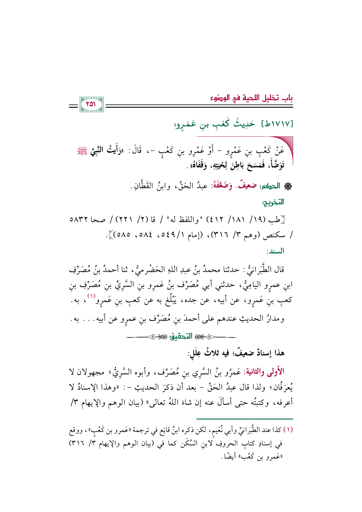 قال (الطَّبَرانيّ): حدثنا محمدُ بنُ عبدِ اللهِ الحَضْرمي، ثنا أحمدُ بنُ مُصَرِّف بن عمرٍو اليامِيُّ، حدثني أبي مُصَرِّف بن عَمرِو بن السَّرِيِّ بن مُصَرِّف بن كعب بن عَمرٍو، عن أبيه، عن جده، يَبْلُغ به عن كعب بن عَمرٍو (¬١)، به.
