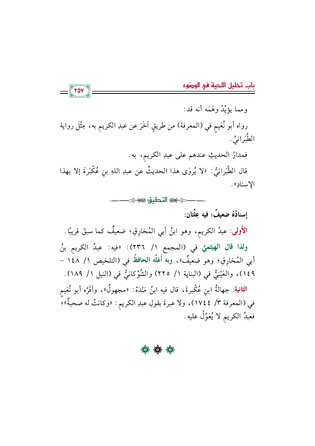 ولذا قال الهيثميُّ في (المجمع ١/ ٢٣٦): "فيه عبد الكريم بن أبي المُخارِقِ؛ وهو ضعيفٌ"، وبه أَعَلَّه الحافظ في (التلخيص ١/ ١٤٨ - ١٤٩) والعَيْنيُّ في (البناية ١/ ٢٢٥) والشَّوْكانيُّ في (النيل ١/ ١٨٩).