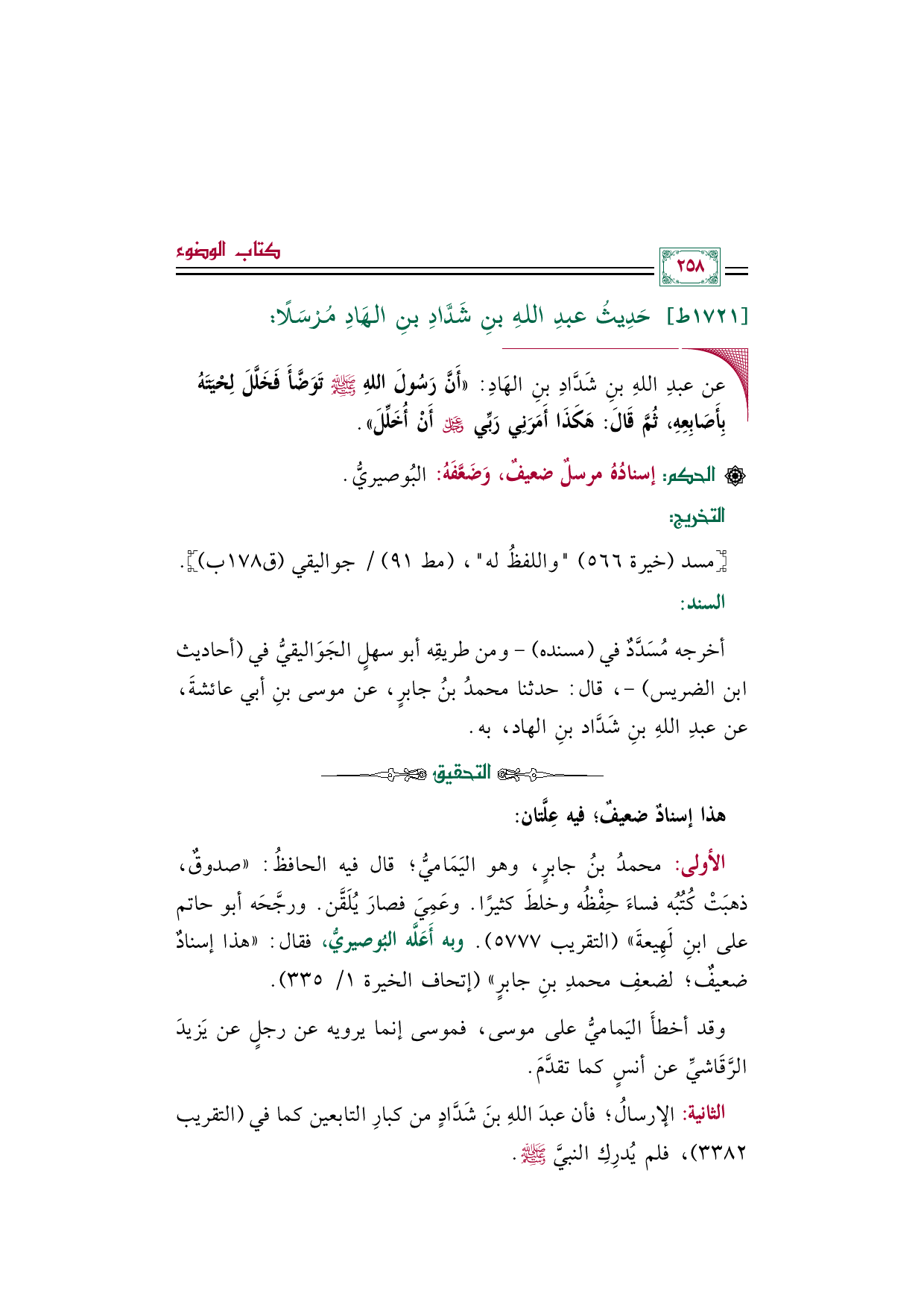 الثانية: الإرسال؛ فأن عبدَ الله بن شَدَّاد من كبار التابعين كما في (التقريب ٣٣٨٢)، فلم يُدرِكِ النبيَّ صلى الله عليه وسلم.