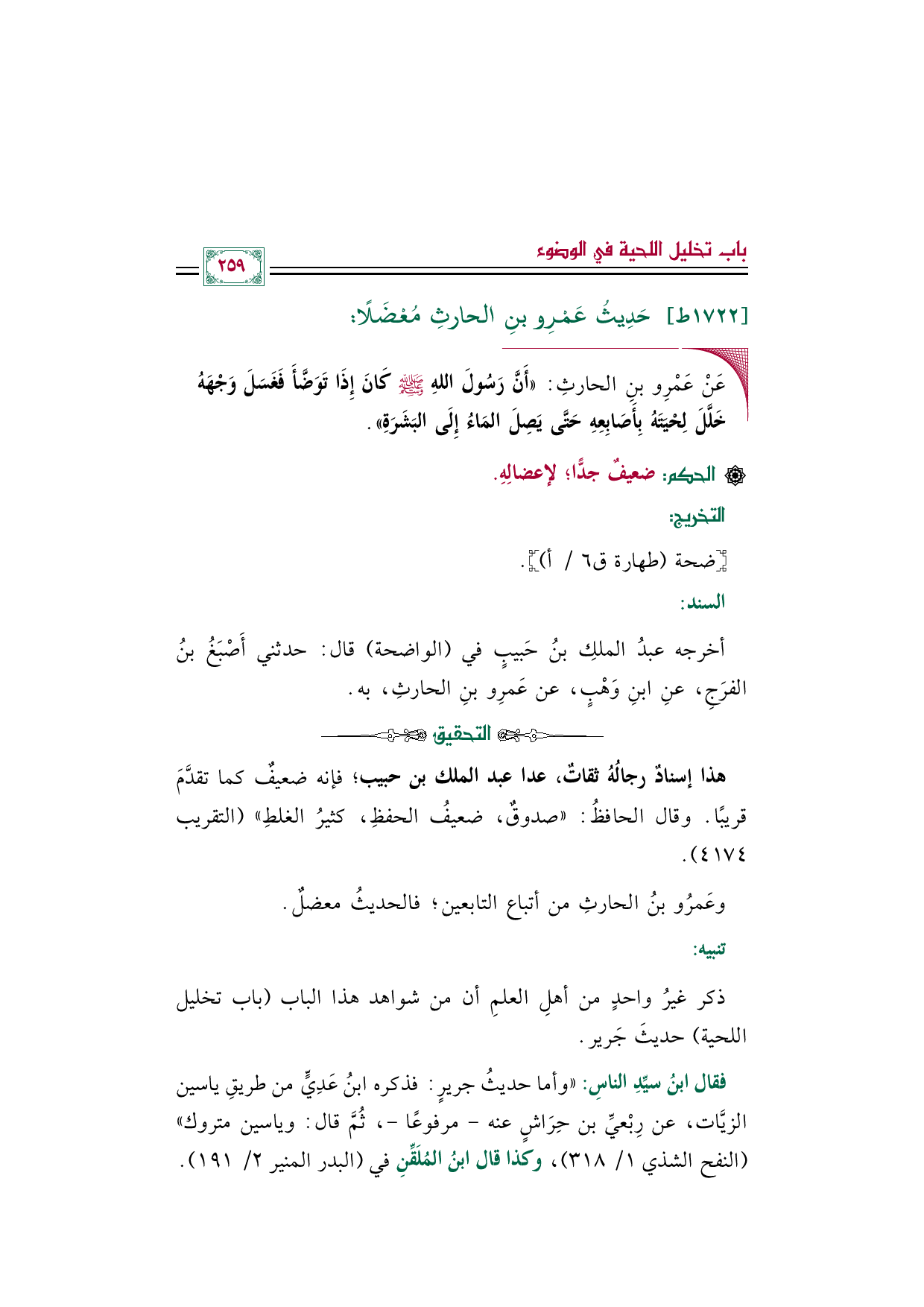 ◼ عَنْ عَمْرِو بنِ الحارثِ: ((أَنَّ رَسُولَ اللهِ صلى الله عليه وسلم كَانَ إِذَا تَوَضَّأَ فَغَسَلَ وَجْهَهُ خَلَّلَ لِحْيَتَهُ بِأَصَابِعِهِ حَتَّى يَصِلَ المَاءُ إِلَى الْبَشَرَةِ)).
