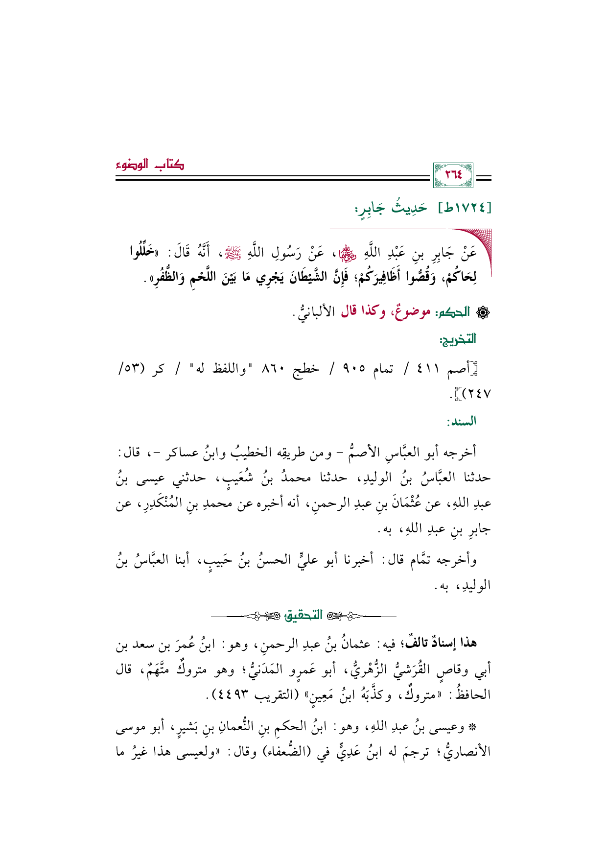 أخرجه أبو العبَّاسِ الأصمُّ - ومن طريقِه الخطيبُ وابنُ عساكر -، قال: حدثنا العبَّاسِ بن الوليد، حدثنا محمدُ بن شُعَيب، حدثني عيسى بن عبد الله، عن عُثْمَانَ بن عبد الرحمن، أنه أخبره عن محمدِ بنِ المُنْكَدِر، عن جابر بن عبد الله، به.