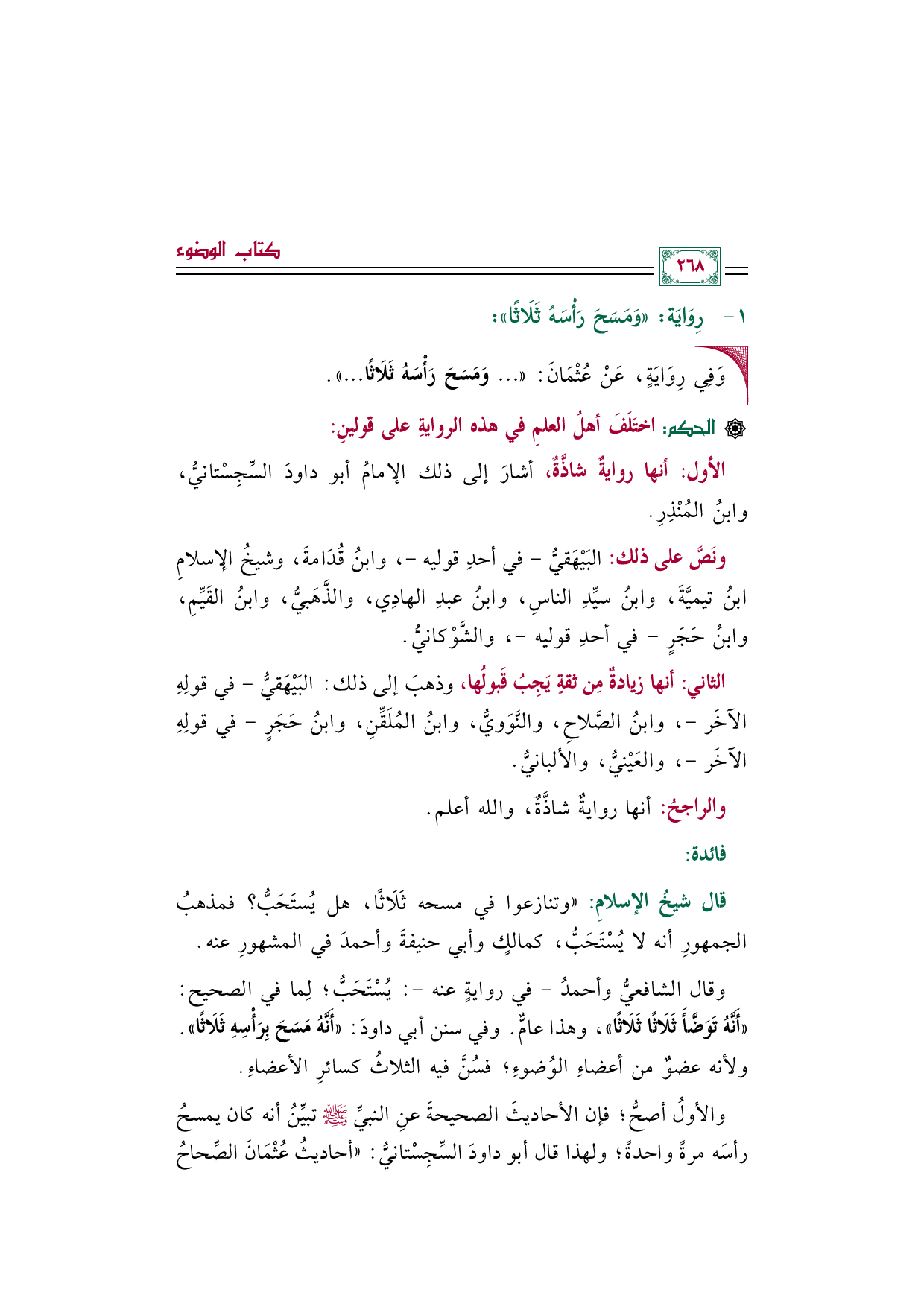 والأول أصح؛ فإن الأحاديث الصحيحة عنِ النبيِّ صلى الله عليه وسلم تبيِّن أنه كان يمسح رأسَه مرة واحدة؛ ولهذا قال أبو داودَ السِّجِسْتانيُّ: أحاديثُ عُثْمَانَ الصِّحاحُ