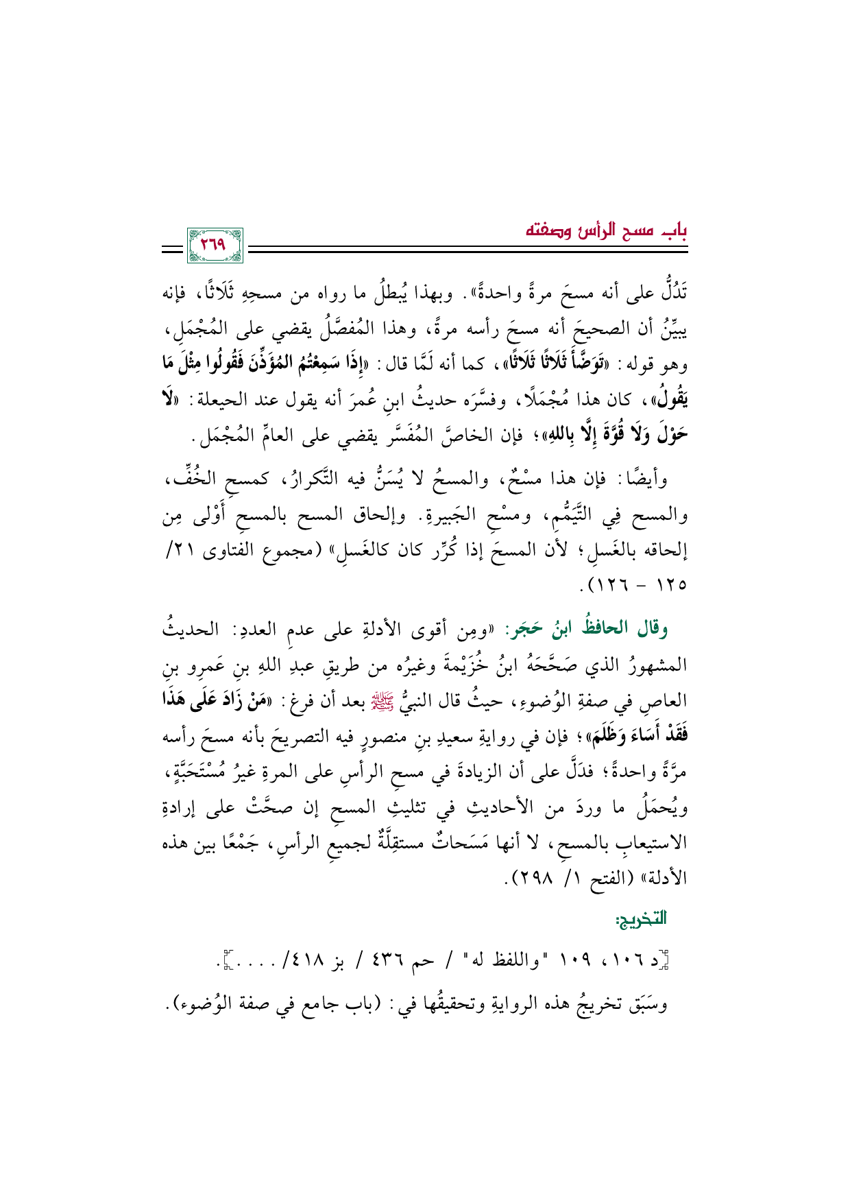 تدل على أنه مسح مرة واحدة. وبهذا يبطل ما رواه من مسحه ثَلَاثًا، فإنه يبيِّن أن الصحيح أنه مسح رأسه مرة، وهذا المُفصَّل يقضي على المُجْمَل، وهو قوله: ((تَوَضَّأَ ثَلَاثًا ثَلَاثًا))، كما أنه لَمَّا قال: ((إِذَا سَمِعْتُمُ المُؤَذِّنَ فَقُولُوا مِثْلَ مَا يَقُولُ))، كان هذا مُجْمَلًا، وفسَّرَه حديثُ ابنِ عُمرَ أنه يقول عند الحيعلة: ((لَا حَوْلَ وَلَا قُوَّةَ إِلَّا بِاللهِ))؛ فإن الخاص المُفَسَّر يقضي على العامِّ المُجْمَل.