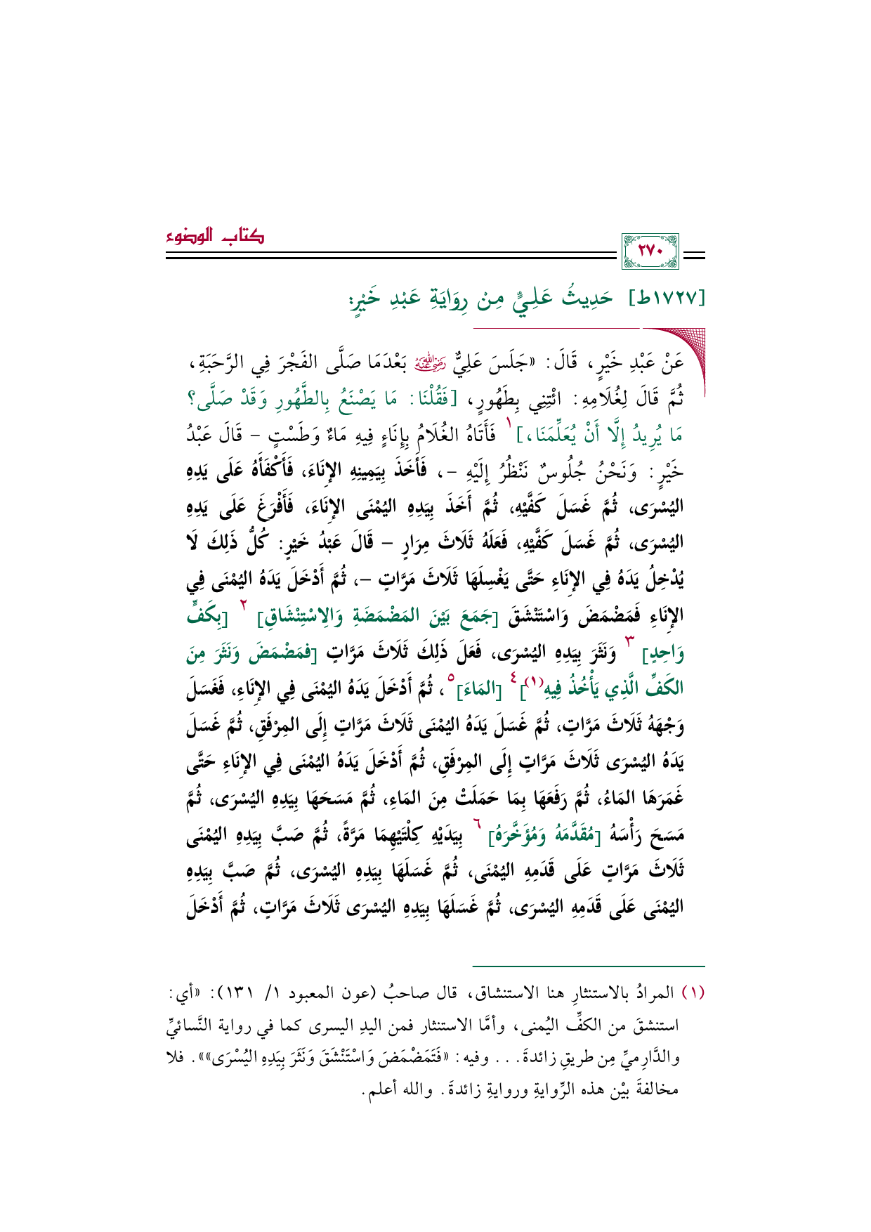 ◼ عَنْ عَبْدِ خَيْرٍ، قَالَ: جَلَسَ عَلِيٌّ رضي الله عنه بَعْدَمَا صَلَّى الفَجْرَ فِي الرَّحَبَةِ، ثُمَّ قَالَ لِغُلَامِهِ: ائْتِنِي بِطَهُورٍ، [فَقُلْنَا: مَا يَصْنَعُ بِالطَّهُورِ وَقَدْ صَلَّى؟ مَا يُرِيدُ إِلَّا أَنْ يُعَلِّمَنَا، ] ١ فَأَتَاهُ الْغُلَامُ بِإِنَاءٍ فِيهِ مَاءٌ وَطَسْتٍ - قَالَ عَبْدُ خَيْرٍ: وَنَحْنُ جُلُوسٌ نَنْظُرُ إِلَيْهِ -، فَأَخَذَ بِيَمِينِهِ الإِنَاءَ، فَأَكْفَأَهُ عَلَى يَدِهِ اليُسْرَى، ثُمَّ غَسَلَ كَفَّيْهِ، ثُمَّ أَخَذَ بِيَدِهِ اليُمْنَى الإِنَاءَ، فَأَفْرَغَ عَلَى يَدِهِ اليُسْرَى، ثُمَّ غَسَلَ كَفَّيْهِ، فَعَلَهُ ثَلَاثَ مِرَارٍ - قَالَ عَبْدُ خَيْرٍ: كُلُّ ذَلِكَ لَا يُدْخِلُ يَدَهُ فِي الإِنَاءِ حَتَّى يَغْسِلَهَا ثَلَاثَ مَرَّاتٍ -، ثُمَّ أَدْخَلَ يَدَهُ اليُمْنَى فِي الإِنَاءِ فَمَضْمَضَ وَاسْتَنْشَقَ [جَمَعَ بَيْنَ المَضْمَضَةِ وَالِاسْتِنْشَاقِ] ٢ [بِكَفٍّ وَاحِدٍ] ٣ وَنَثَرَ بِيَدِهِ اليُسْرَى، فَعَلَ ذَلِكَ ثَلَاثَ مَرَّاتٍ [فمَضْمَضَ وَنَثَرَ مِنَ الْكَفِّ الَّذِي يَأْخُذُ فِيهِ (¬١)]