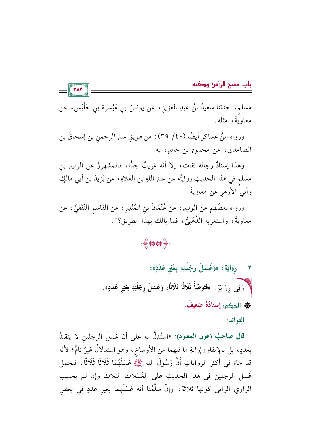 "استُدِلَّ به على أن غَسل الرجلين لا يتقيد بعدد، بل بالإنقاء وإزالة ما فيهما من الأوساخ، وهو استدلال غيرُ تامٍّ؛ لأنه قد جاءَ في أكثر الروايات أَنَّ رَسُولَ اللهِ صلى الله عليه وسلم غَسَلَهُمَا ثَلَاثًا ثَلَاثًا. فيحمل غَسل الرجلين في هذا الحديثِ على الغَسَلات الثلاث وإن لم يحسب الراوي الرائي كونها ثلاثة، وإنْ سلَّمْنا أنه غَسَلَهما بغير عدد في بعض