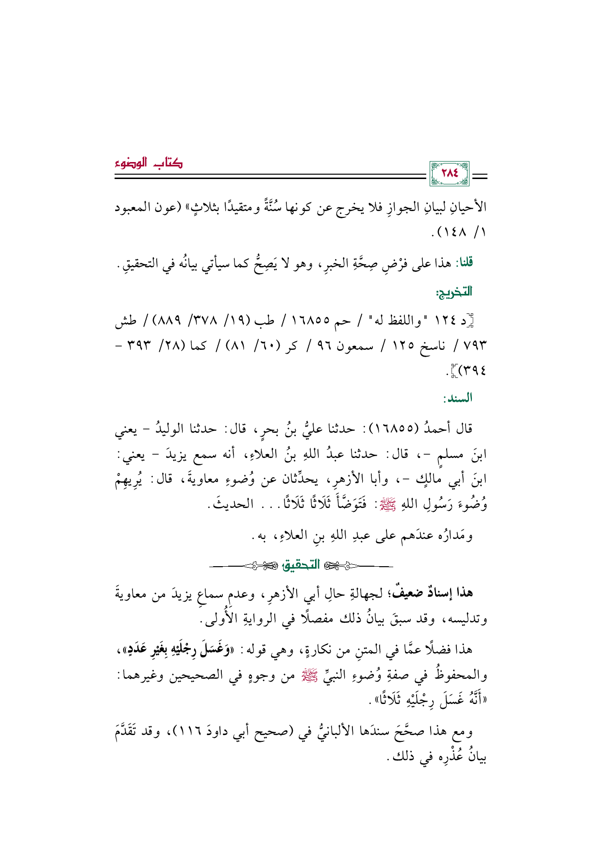هذا فضلًا عما في المتنِ من نكارة، وهي قوله: ((وَغَسَلَ رِجْلَيْهِ بِغَيْرِ عَدَدٍ))، والمحفوظُ في صفة وُضوء النبي صلى الله عليه وسلم من وجوه في الصحيحين وغيرهما: أَنَّهُ غَسَلَ رِجْلَيْهِ ثَلَاثًا.