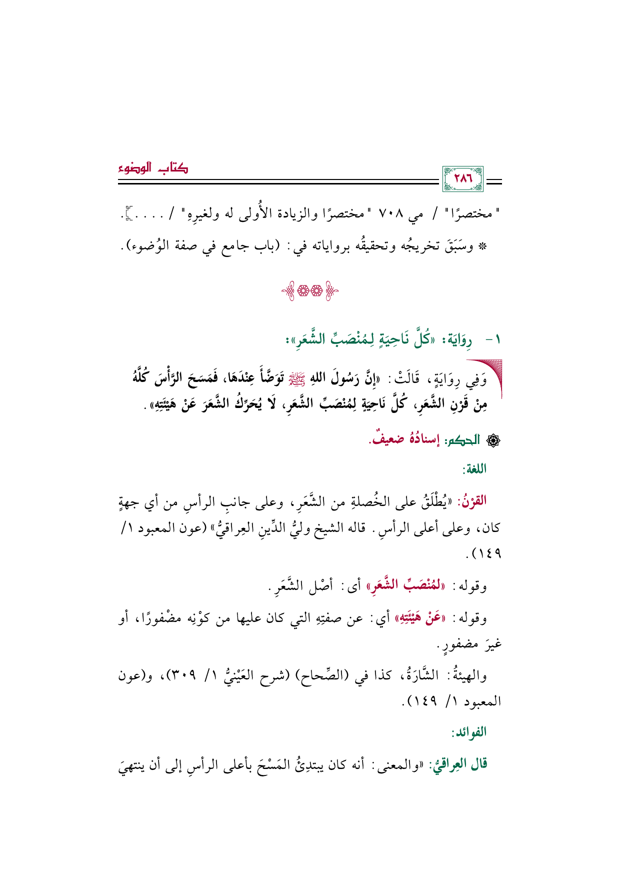 قال العِراقيُّ: " والمعنى: أنه كان يبتدِئ المَسْح بأعلى الرأس إلى أن ينتهيَ