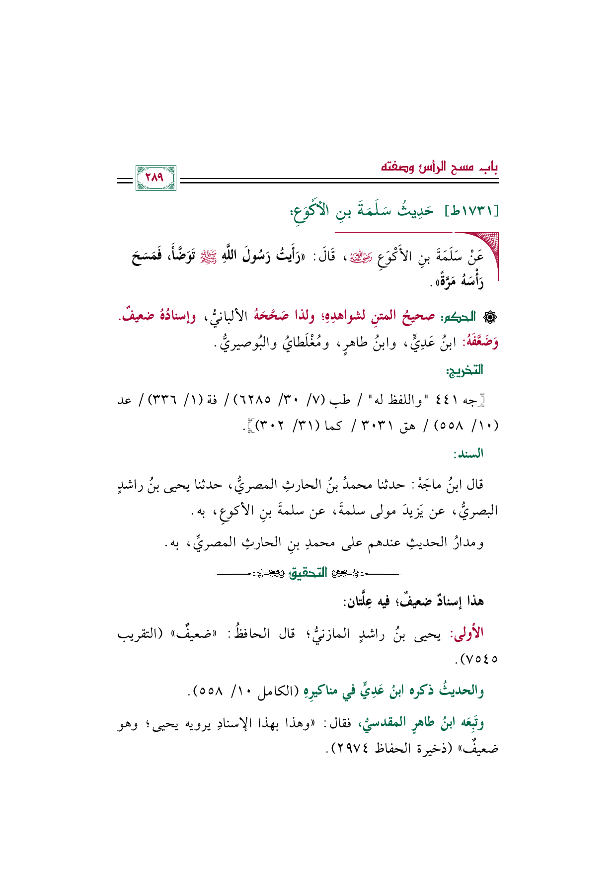 قال (ابن ماجَهْ): حدثنا محمدُ بن الحارث المصري، حدثنا يحيى بن راشد البصري، عن يَزيدَ مولى سلمة، عن سلمة بن الأكوع، به.