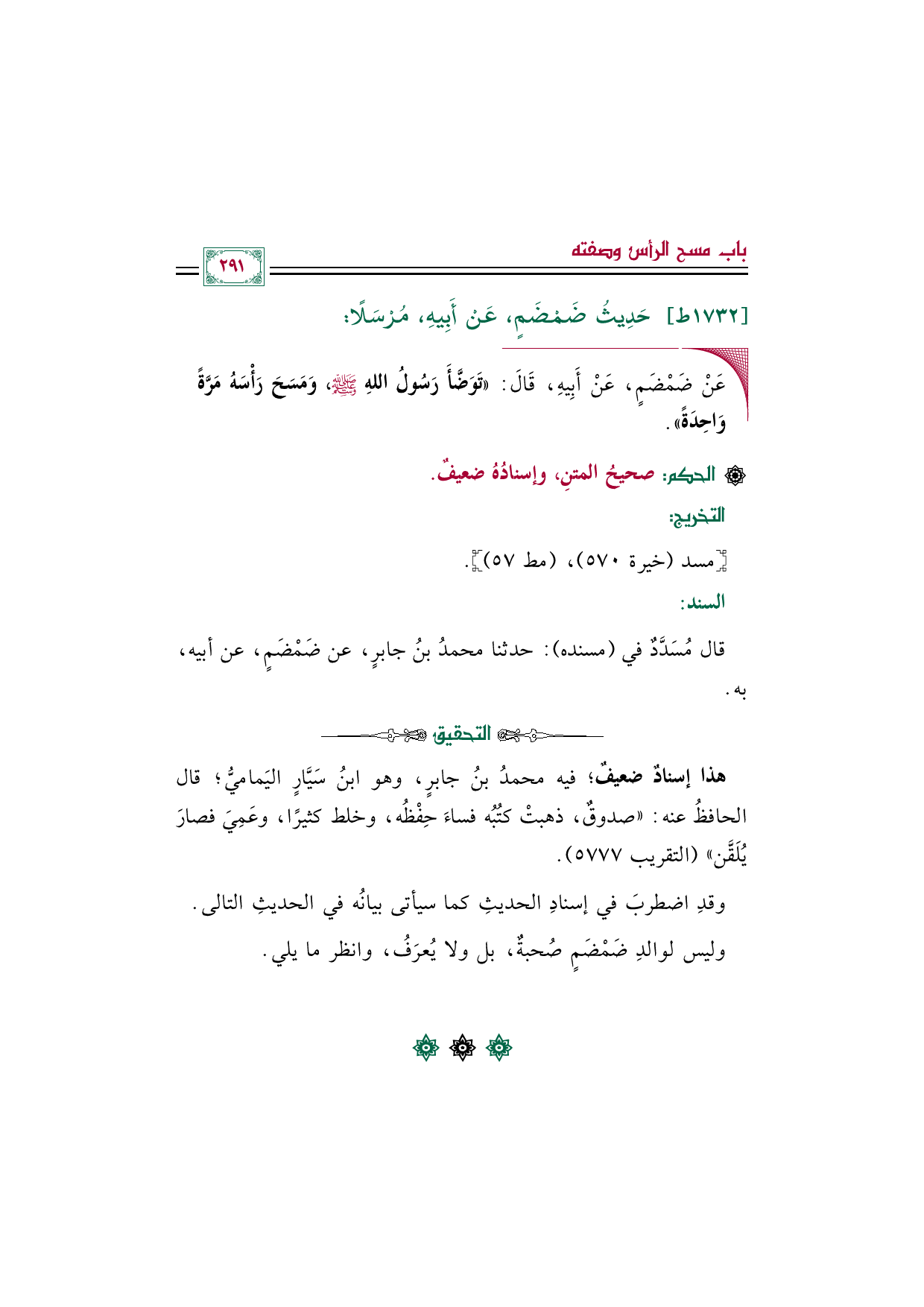 ◼ عَنْ ضَمْضَمٍ، عَنْ أَبِيهِ، قَالَ: «تَوَضَّأَ رَسُولُ اللهِ صلى الله عليه وسلم، وَمَسَحَ رَأْسَهُ مَرَّةً وَاحِدَةً».