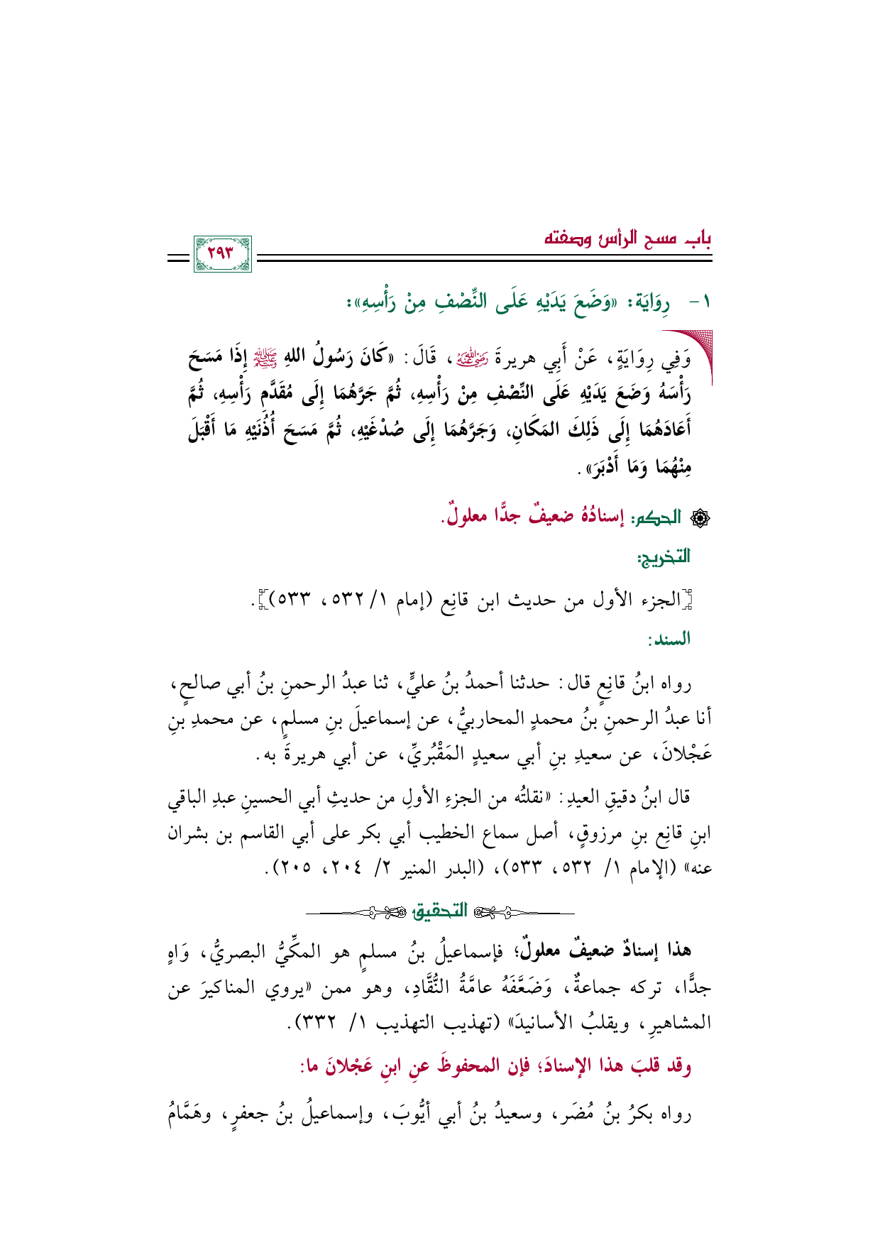 رواه ابنُ قانِع قال: حدثنا أحمدُ بنُ عليٍّ، ثنا عبدُ الرحمنِ بنُ أبي صالحٍ، أنا عبدُ الرحمنِ بنُ محمد المحاربي، عن إسماعيل بن مسلم، عن محمدِ بنِ عَجْلانَ، عن سعيد بن أبي سعيد المَقْبُريِّ، عن أبي هريرةَ به.