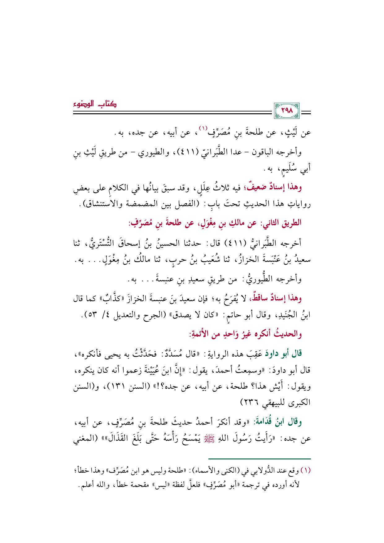 قال أبو داودَ عَقِبَ هذه الرواية: قال مُسَدَّد: فحدثْتُ به يحيى فأنكره، قال أبو داودَ: وسمِعتُ أحمد، يقول: «أنَّ ابنَ عُيَيْنةَ زعموا أنه كان ينكره، ويقول: أَيْش هذا؟ طلحة، عن أبيه، عن جده؟ ! » (السنن ١٣١)، و (السنن الكبرى للبيهقي ٢٣٦)