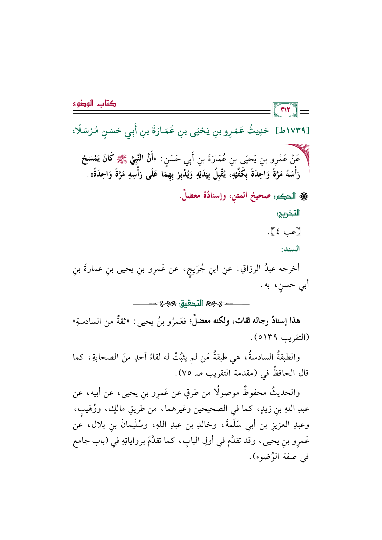 هذا إسناد رجاله ثقات، ولكنه معضل؛ فعَمرو بن يحيى: "ثقة من السادسة" (التقريب ٥١٣٩).